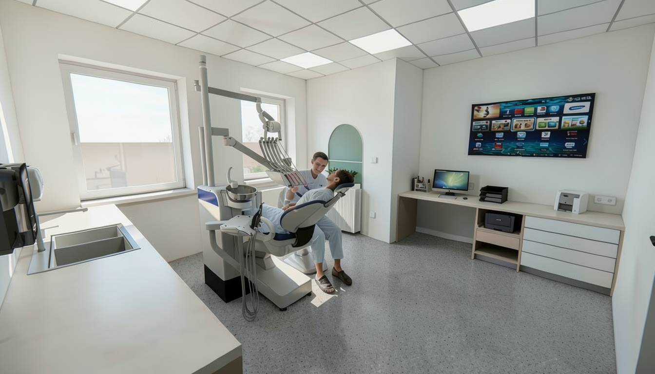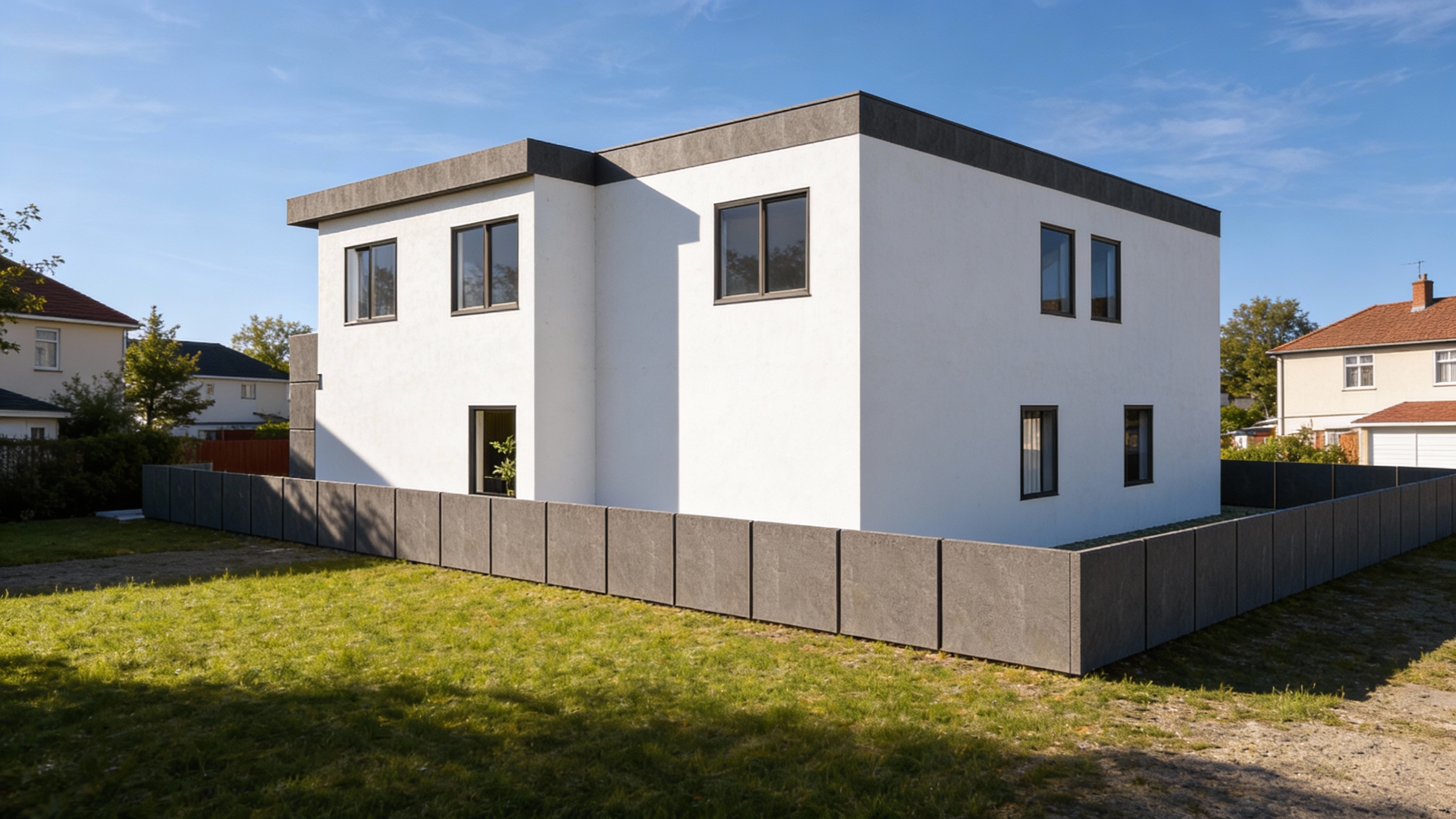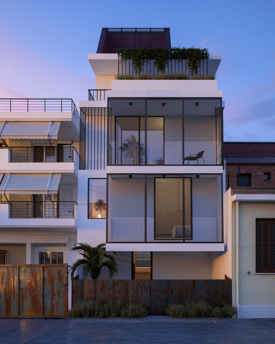 add realism to this image and as for materials in the facade the concrete surface is all the same white solid color not rough its matte and in front of the windows dark color grey close to black metallic frame holding a thin metal grating grill panel and cor ten metal texture without many waters in the metal in the entrance gate and the give a view in a warm sunset about serene atmosphere not many clouds