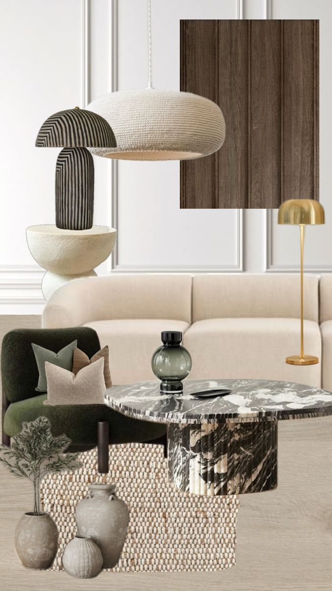render a sophisticated modern living room interior a beige sectional sofa against a white paneled wall creating a calm neutral backdrop a round black and white marble coffee table as the centerpiece adorned with a dark glass vase feature a dark green armchair with assorted beige and brown pillows for a touch of elegance include a woven textured rug in soft earthy tones highlight the space with a large woven pendant light in off white complemented by a striped black and white sculpture add a gold minimalist floor lamp for a hint of luxury incorporate a textured wall panel in dark brown wood drawing attention to the room s contrasting textures place decorative ceramic vases in muted grey on the floor for added detail set the scene in a warm and inviting atmosphere with subtle natural light filtering in