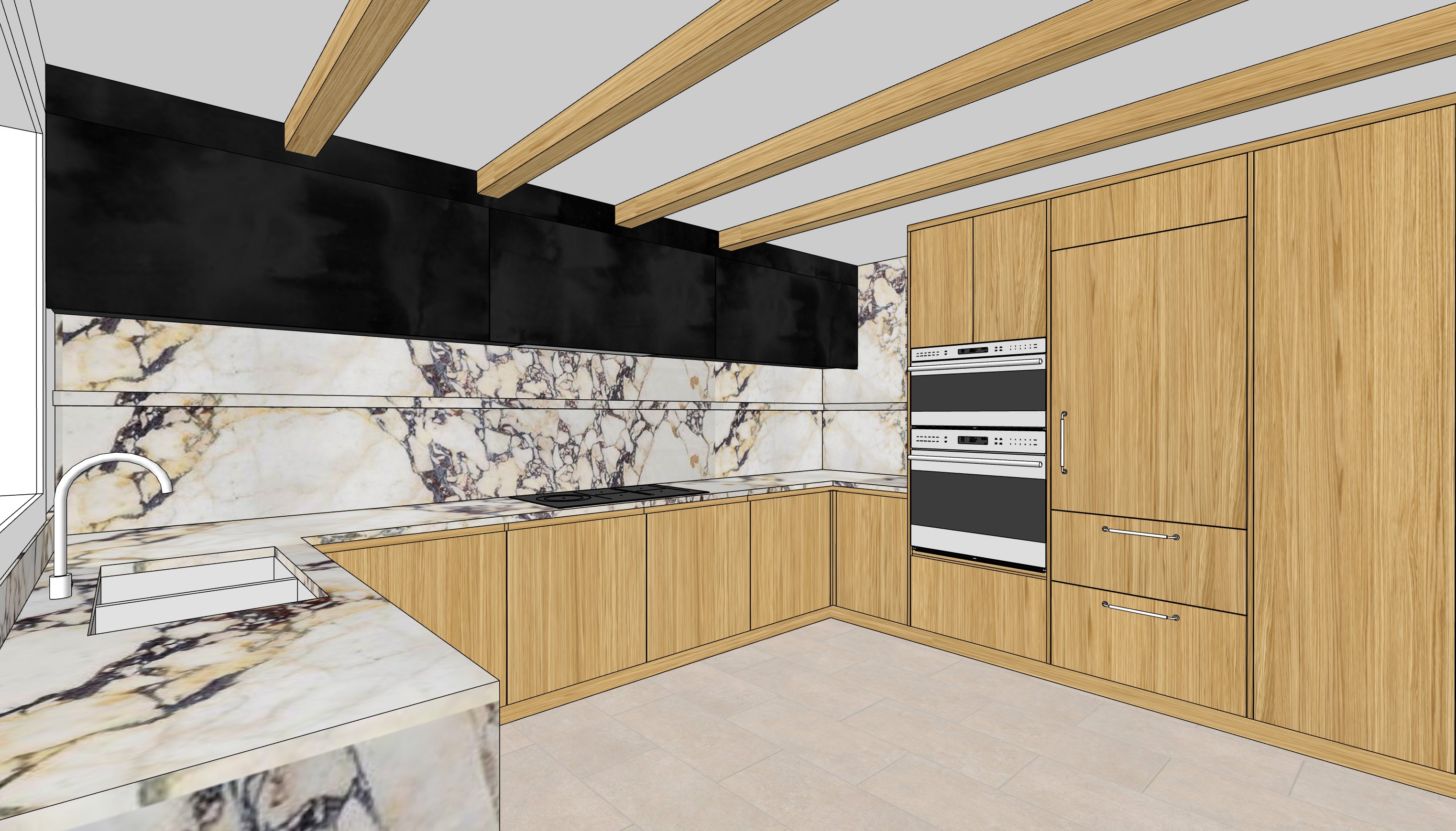 the dark gray cabinets are going to be patina iron color metal cabinet fronts but make sure that the patina is still gray make the color almost like a dark gray color with a little bit of gloss to it while the wood cabinetry are going to be in rift cut natural oak cabinets