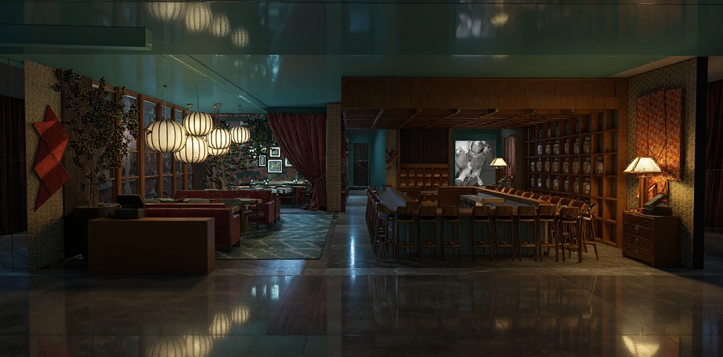 left wall led soji screen panel light source 100 behind wall lights on mural glow bleed towards seating