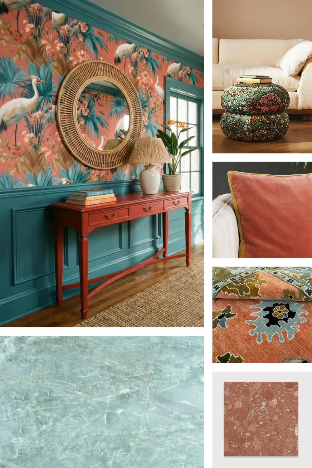 render a high end designer kitchen from the moodboard featuring a slab of emerald green quartzite as the countertops and backsplash show any light fixtures as illuminated and add warm sunlight from nearby windows ensure there are several plants around the space and staged with food prep emerald green quartzite has a jade green background with white and amber fractured veins