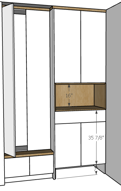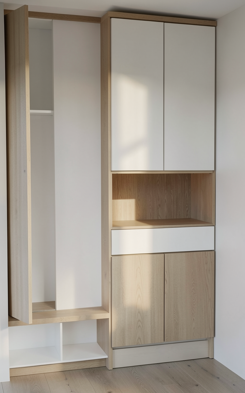 render it in natural scandinavian style the side panel is wood color no plant on the bench the panel inside the open door is white the bench is close with door