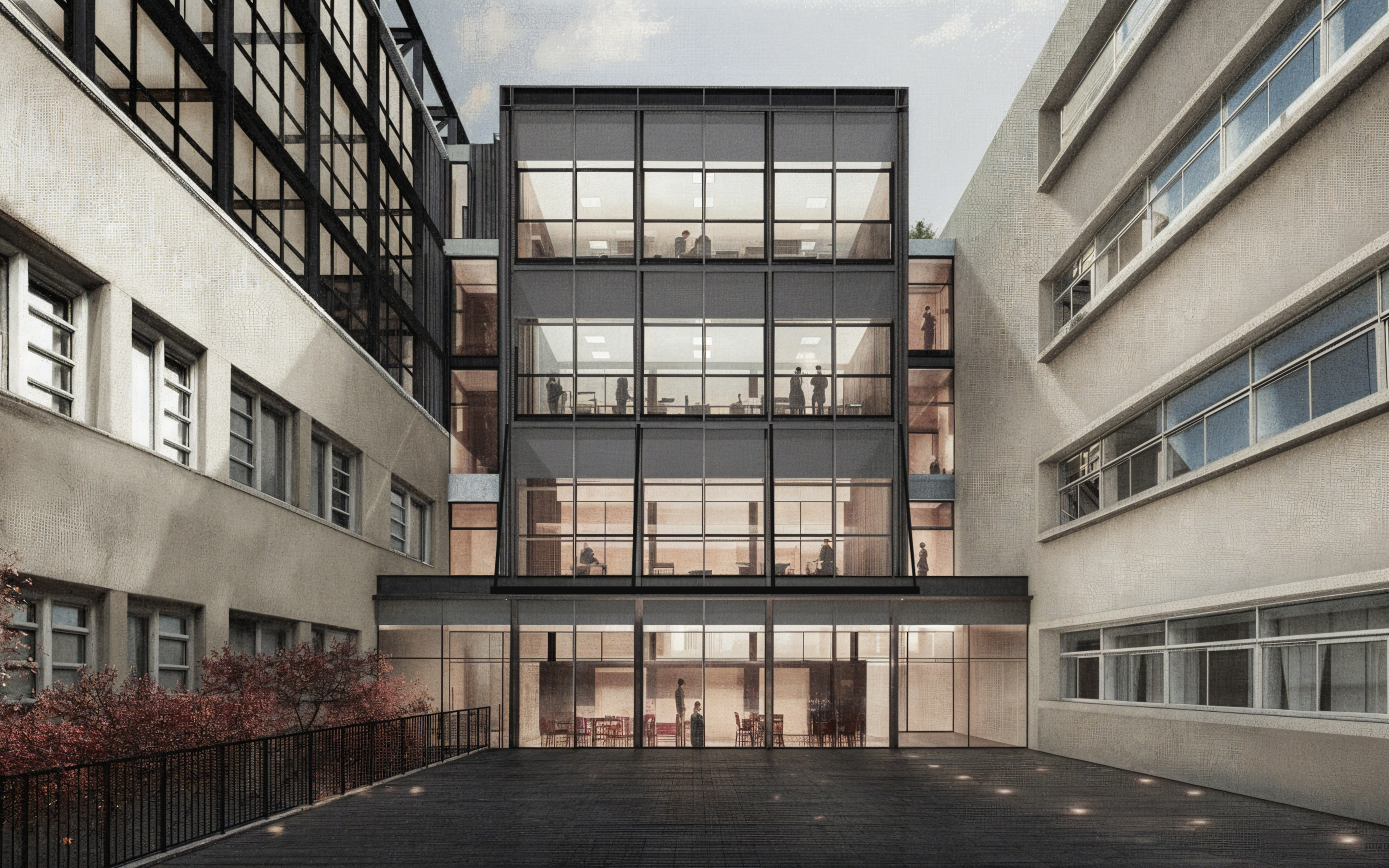 metal structure building black steel profiles glazed fa ade steel eave attached with steel cables outdoor space is paved with black granite tiles at right side is paved with expanded metal on both sides beige plaster walls with horizontal wooden framed windows make the scene looking closer from a spot located to the left side do not chance anything from the interior of the building