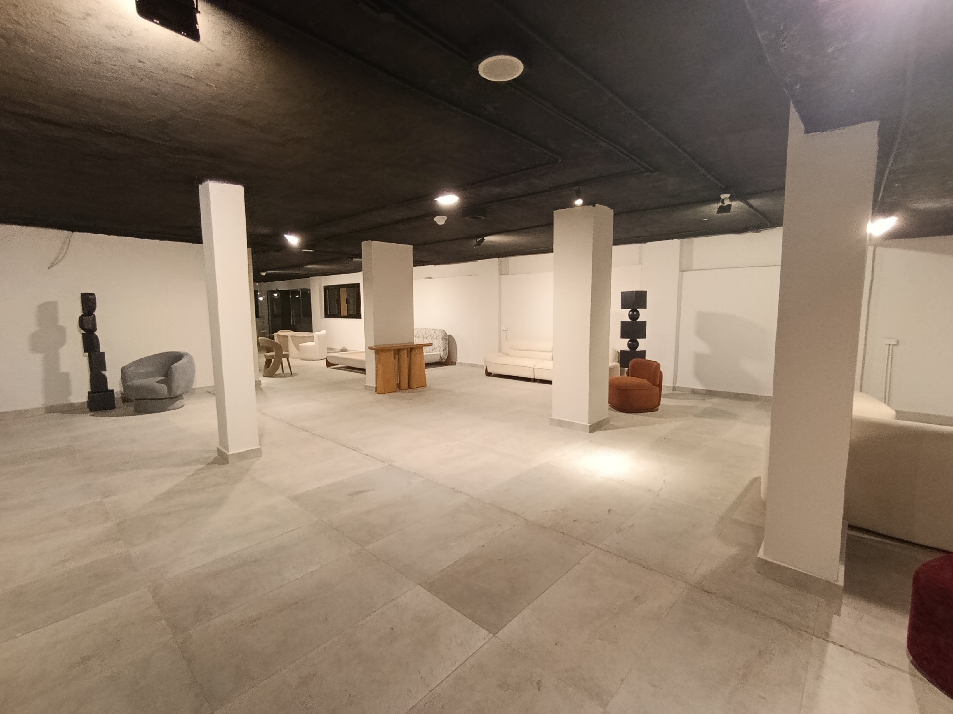 postmodern wide angle shot furniture and home accessories showroom colorful and artist design many small partitions each partition for only 1 supplier rugs partition artwork partition lighting partition furniture partition wall textures add artistique partitions to separate every supplier black ceiling grey floor no windows architecture