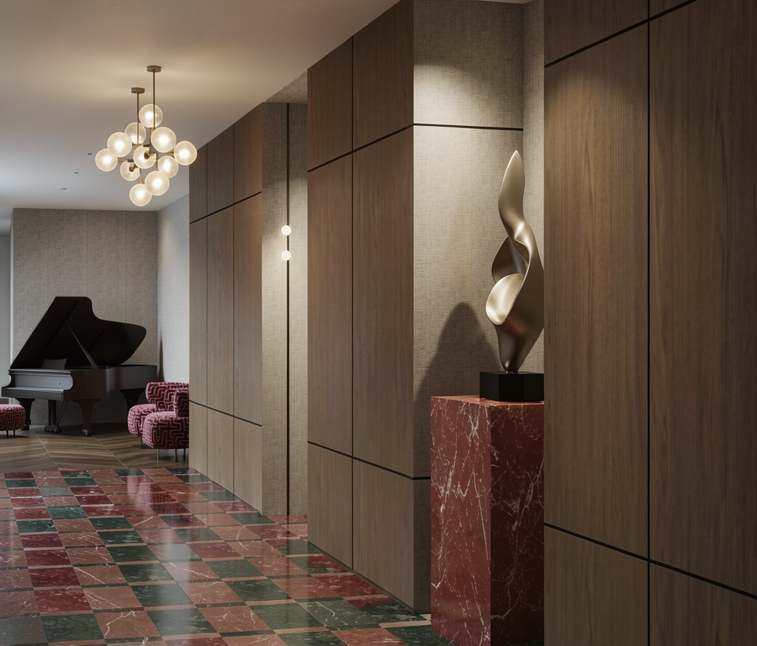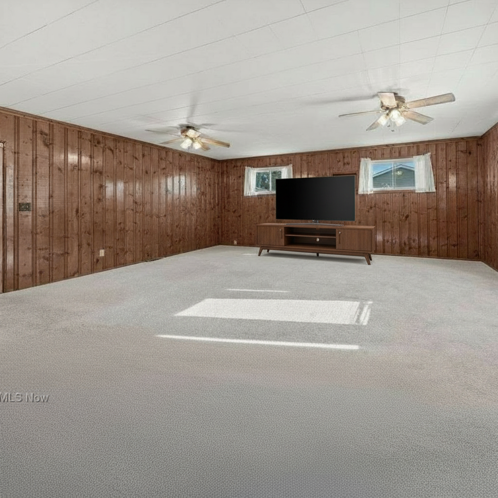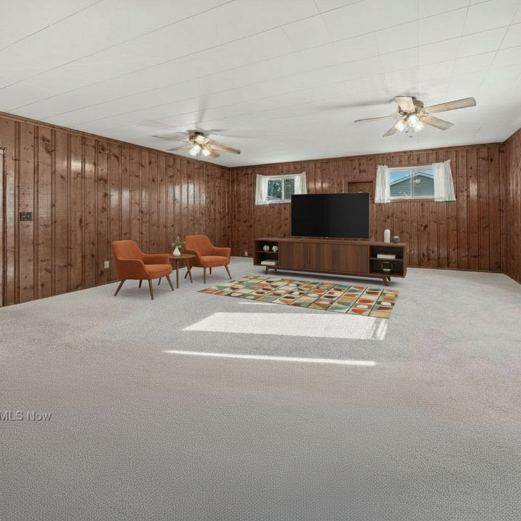 furnish this room with a ceiling height midcentury modern style entertainment center and tv
