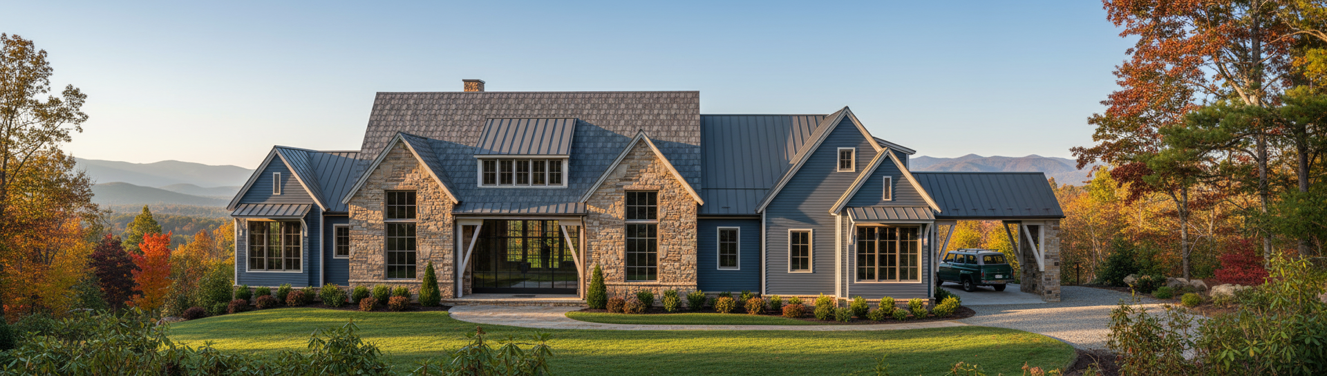 change background to match reference image position selected image below mountain line remove high trees landscape is low laying foulage long driveway to edge of refernece image