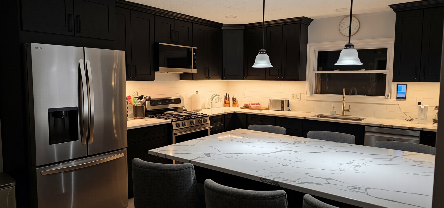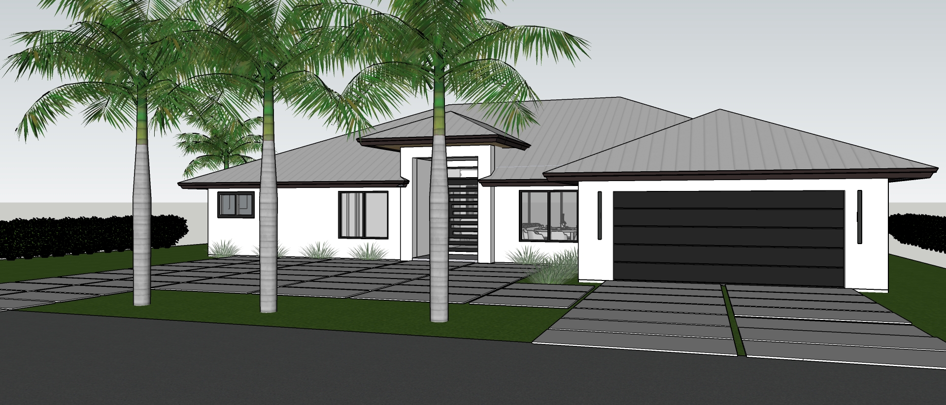 material and texture changes only no geometry or design changes exterior walls smooth white stucco with subtle variation and low reflectivity roof dark bronze standing seam metal with narrow vertical seams and satin metallic sheen windows and doors slim aluminum frames in dark bronze to near black with soft satin finish garage door modern dark metal framed horizontal glass panels lightly tinted with realistic reflections accents warm medium brown wood slats with natural grain and sealed finish where present lighting minimalist vertical wall sconces in dark metal driveway and walkways large format concrete slabs with clean joints and slight surface sheen landscaping lush green lawn and low grasses texture and color only photorealistic daylight retain existing architecture exactly