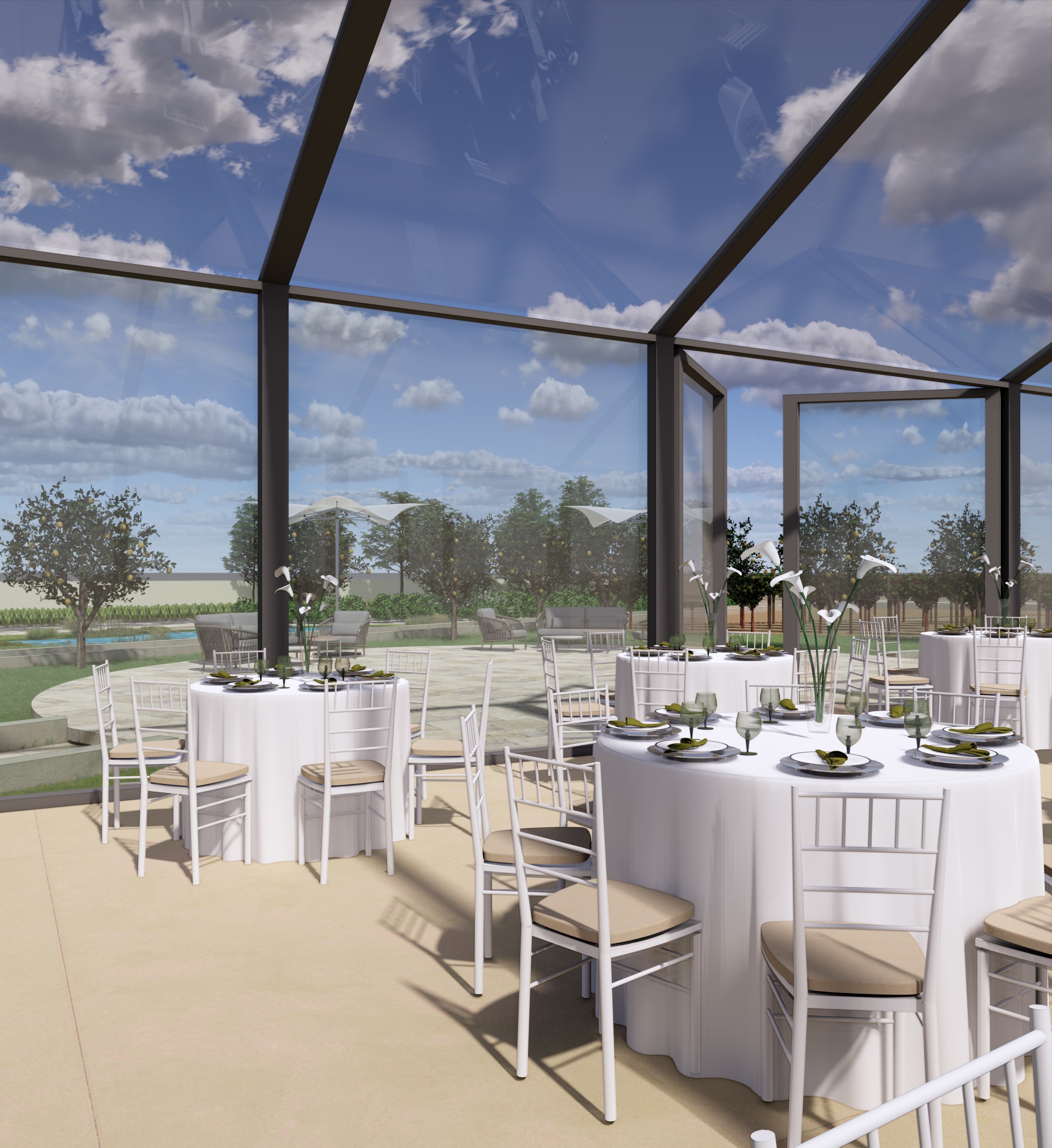 migliora la luce del render migliora il pavimento in pietra chiara allestisci la sala come se ci fosse una cerimonia con lucine in alto e centrotavola con fiori