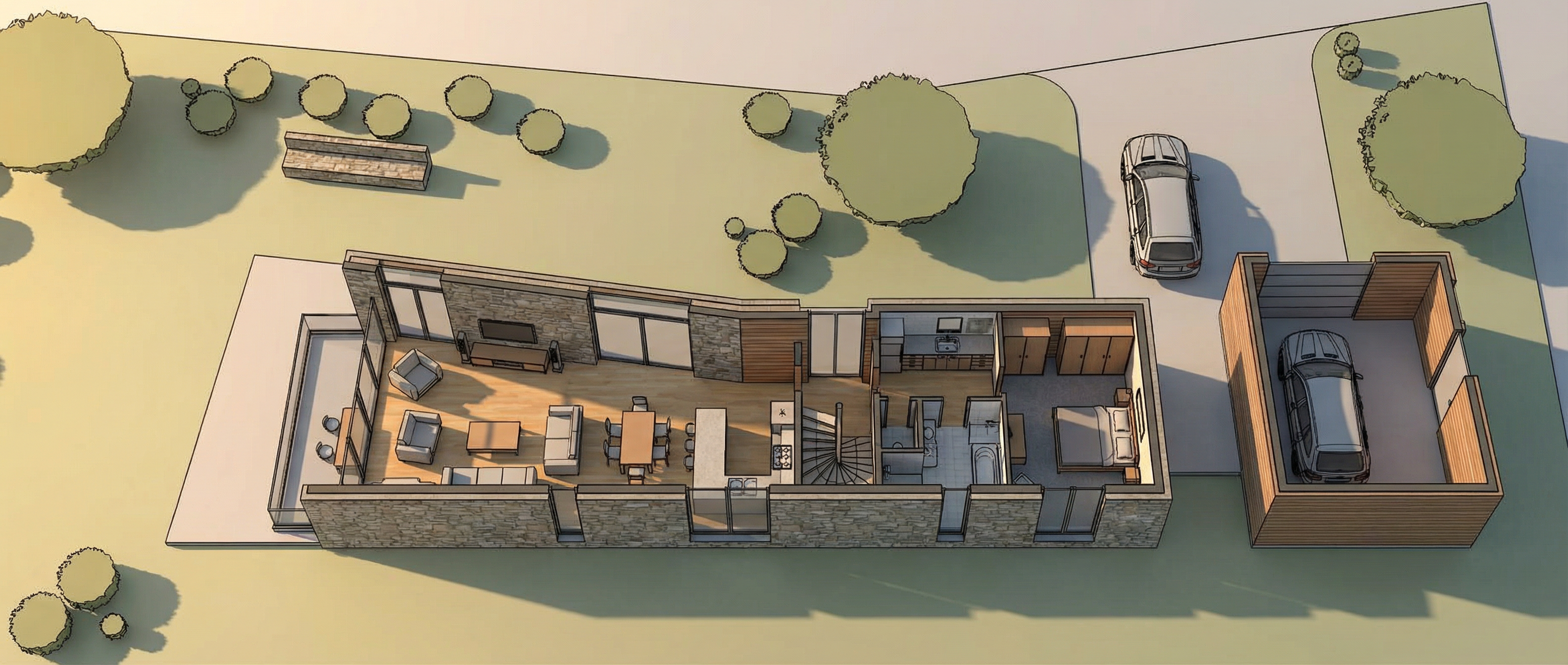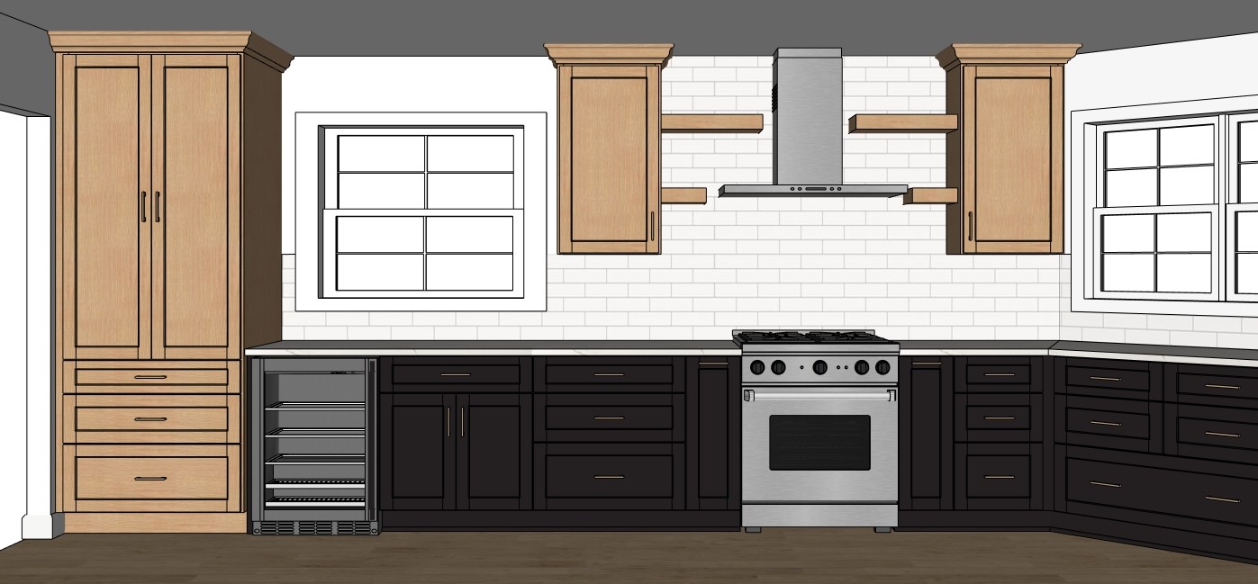 create a beautifully rendered modern kitchen with a cozy and inviting atmosphere use natural wood tones for the tall cabinets and upper cabinets the lower cabinets should be a rich dark espresso brown the countertop is a sleek white marble the wall color is an off white complementing a polished stainless steel stove include a white subway tile backsplash the floor is a warm medium toned wood add subtle warm lighting to enhance the inviting ambiance