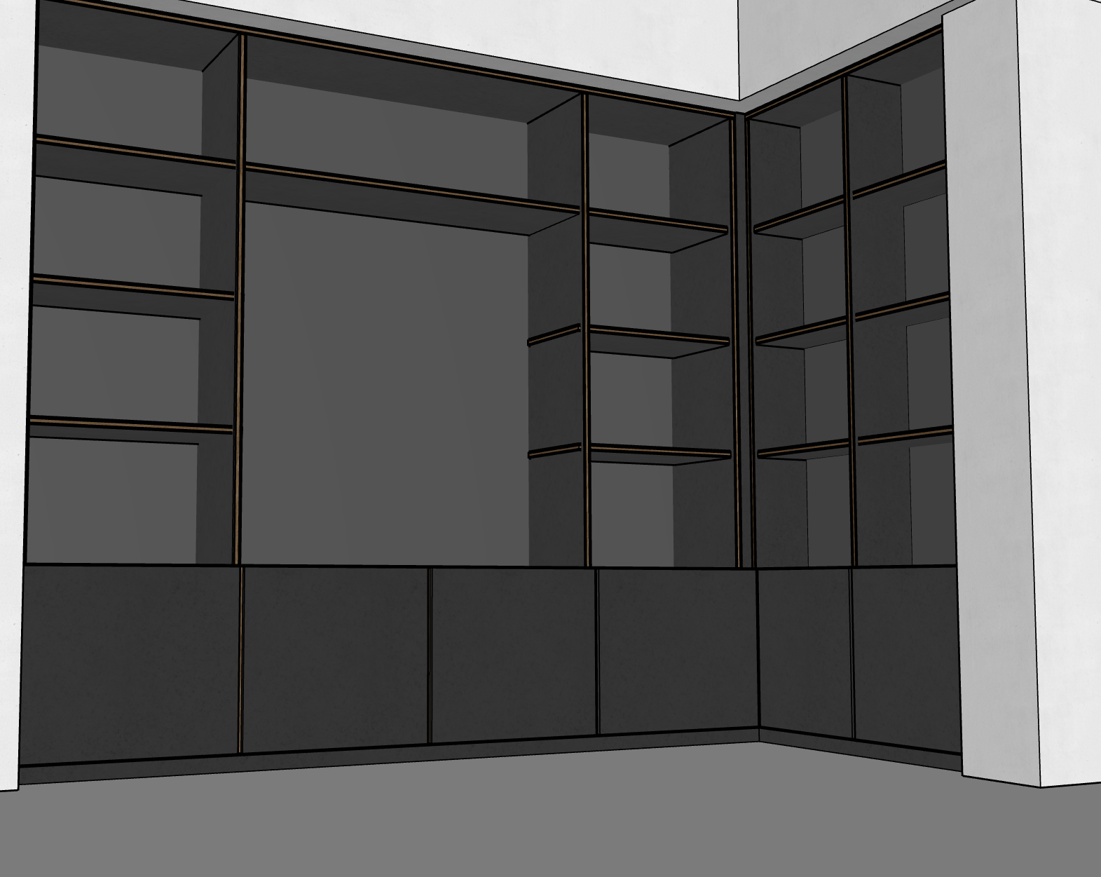 add a high end modern desk and luxury furniture add canned lights pointing down on every shelf level add football memorobilia and a signed football jersey in the middle