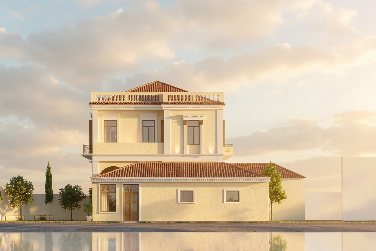 institutional public housing module render social support housing unit government public works project single story small housing module flat concrete roof simple plastered walls low cost construction fixed budget materials white institutional walls with subtle texture gray metal door and window simple concrete slab base realistic construction details natural daylight lighting soft sun shadows realistic ambient light no dramatic lighting context compacted dirt ground simple concrete sidewalk rural semi urban environment minimal vegetation basic utility pole water tank in background include subtle human scale reference simple silhouette or bicycle style realistic architectural visualization public infrastructure project non luxury non commercial dignified social housing camera frontal isometric view technical composition documentary style government presentation render materials realistic plaster texture concrete texture metal matte finishes mood clean functional institutional neutral sober dignified no luxury materials no decorative elements no landscaping design no modern design elements