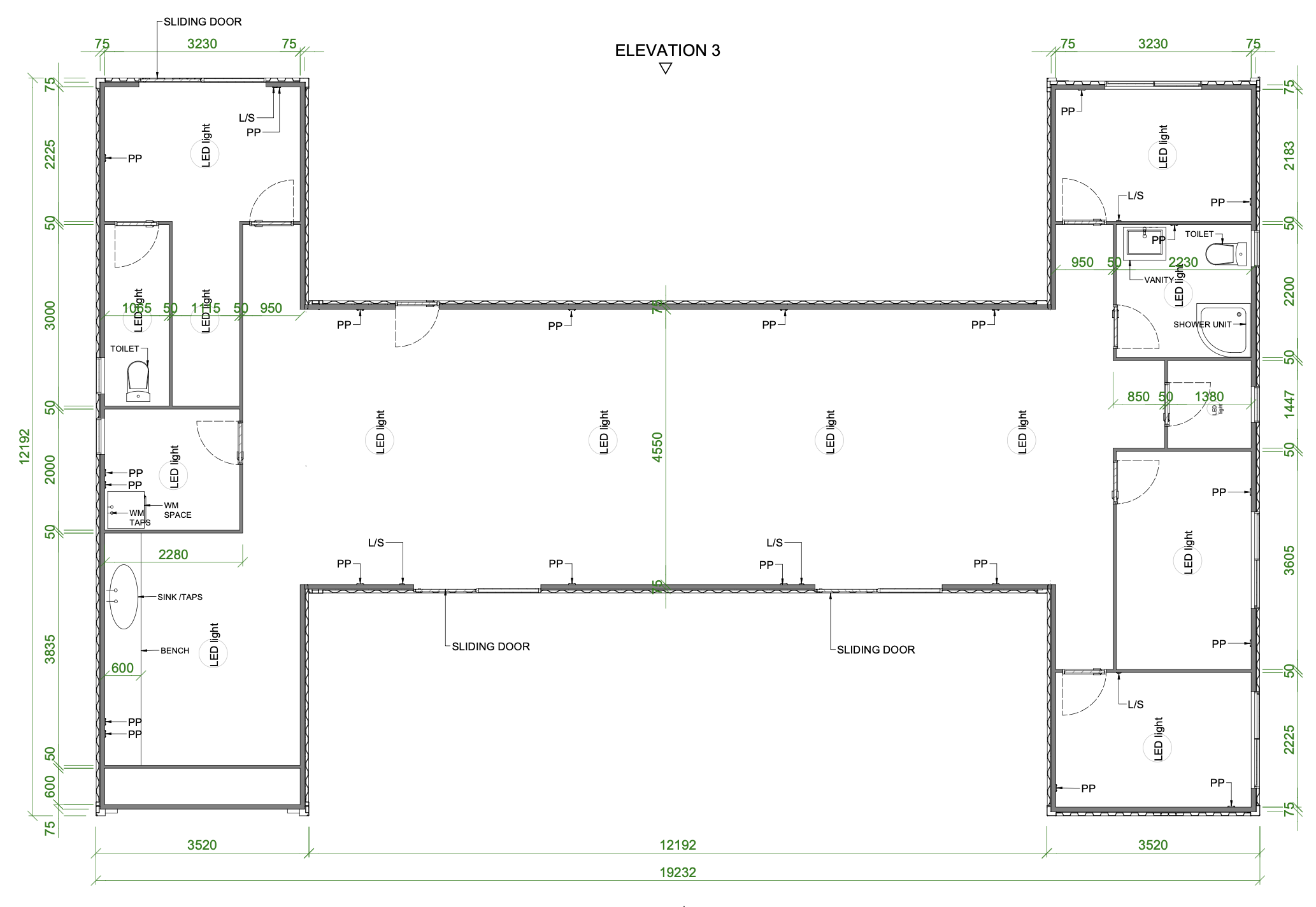 photorealistic architectural floor plan render of a modular building made from shipping containers strictly preserve the exact layout wall positions and dimensions clearly define each container module using realistic 20ft 40ft shipping container proportions with visible steel structure and cut out openings add realistic interior elements including bathrooms sinks shower units sliding doors and led lighting as shown apply natural materials such as corrugated steel walls matte painted interiors and durable flooring enhance with soft shadows ambient occlusion and subtle depth for realism while keeping a clean top down architectural view do not alter structure or layout