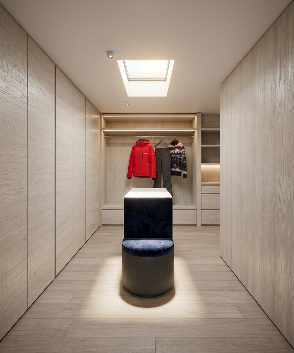 use whitewash oak for the cabinets have light coming from the skylight do not add a window add womens aspen ski clothes to hanging rod show the fabric for the seat as a dark navy velvet