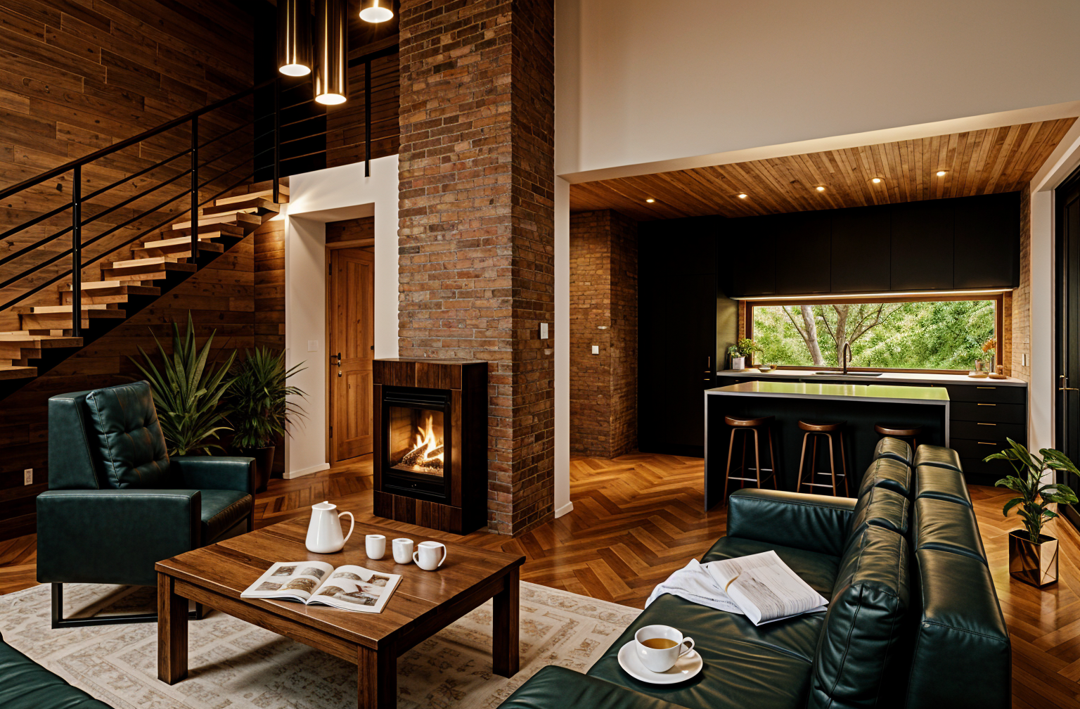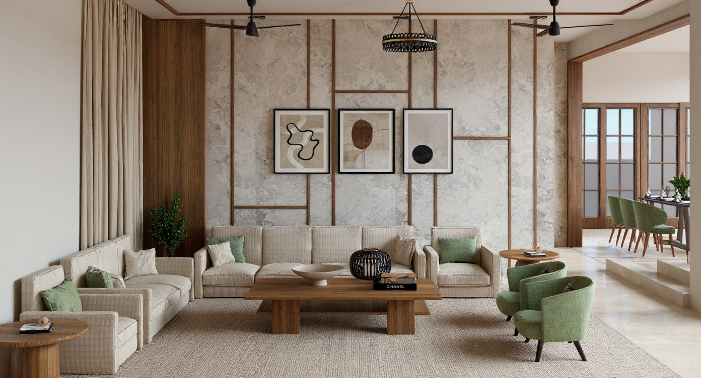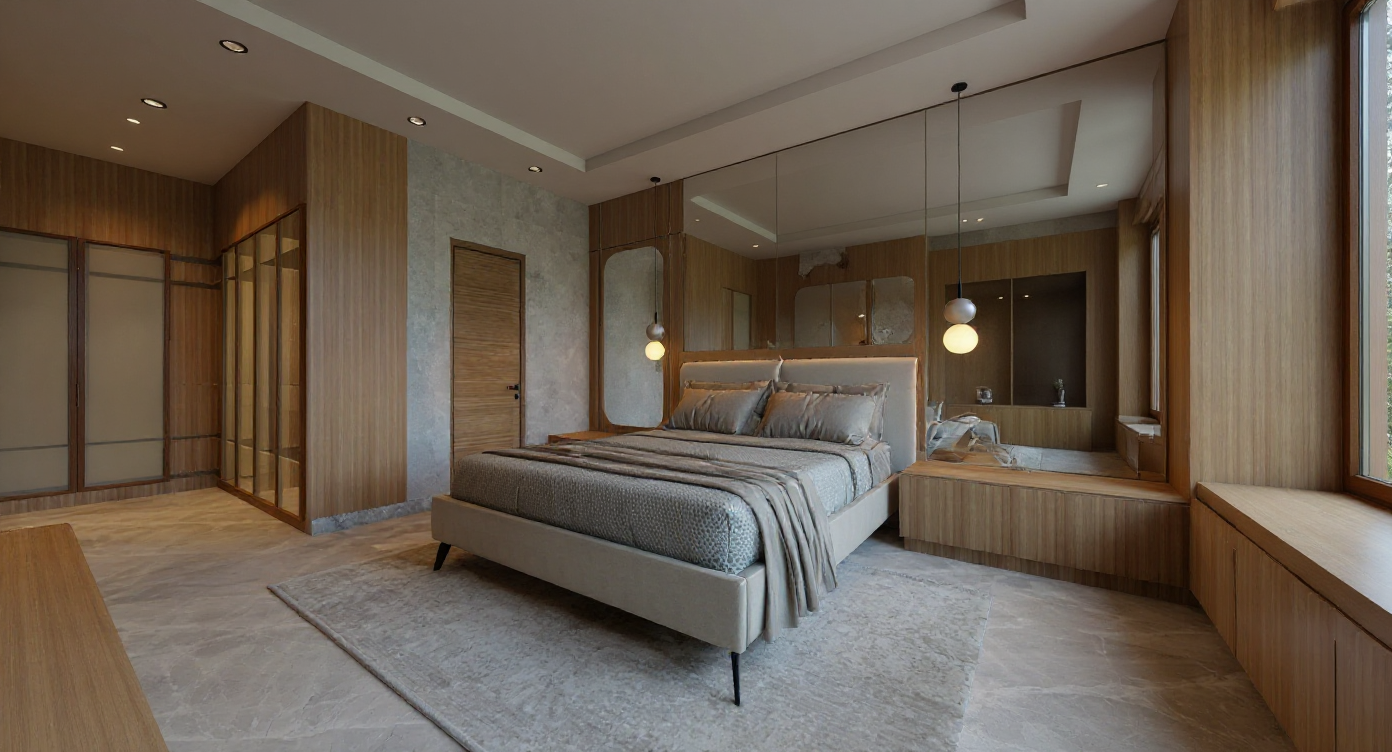provide a realistic render maintain view as per the image change the flooring to light beige textured marble provide a beige textured carpet change the staircase marble to grey textured