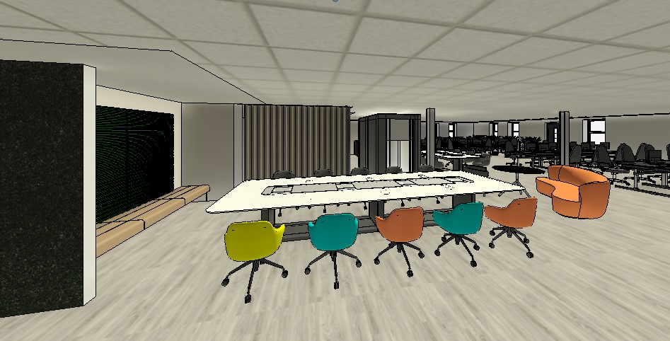 create a realistic and vibrant office space with a modern professional atmosphere use lush deep green for the chairs to convey a sense of calm and sophistication the walls should be painted in a soft olive green to harmonize with the natural tones use a rich dark walnut for the desk providing a sense of warmth and authority the glass partitions should be crystal clear reflecting natural daylight streaming from large windows incorporate golden ambient lighting to create a welcoming and productive environment add a touch of elegance with a subtle pattern on the accent wall in black and gold ensure the flooring is a light oak wood to balance the overall color scheme