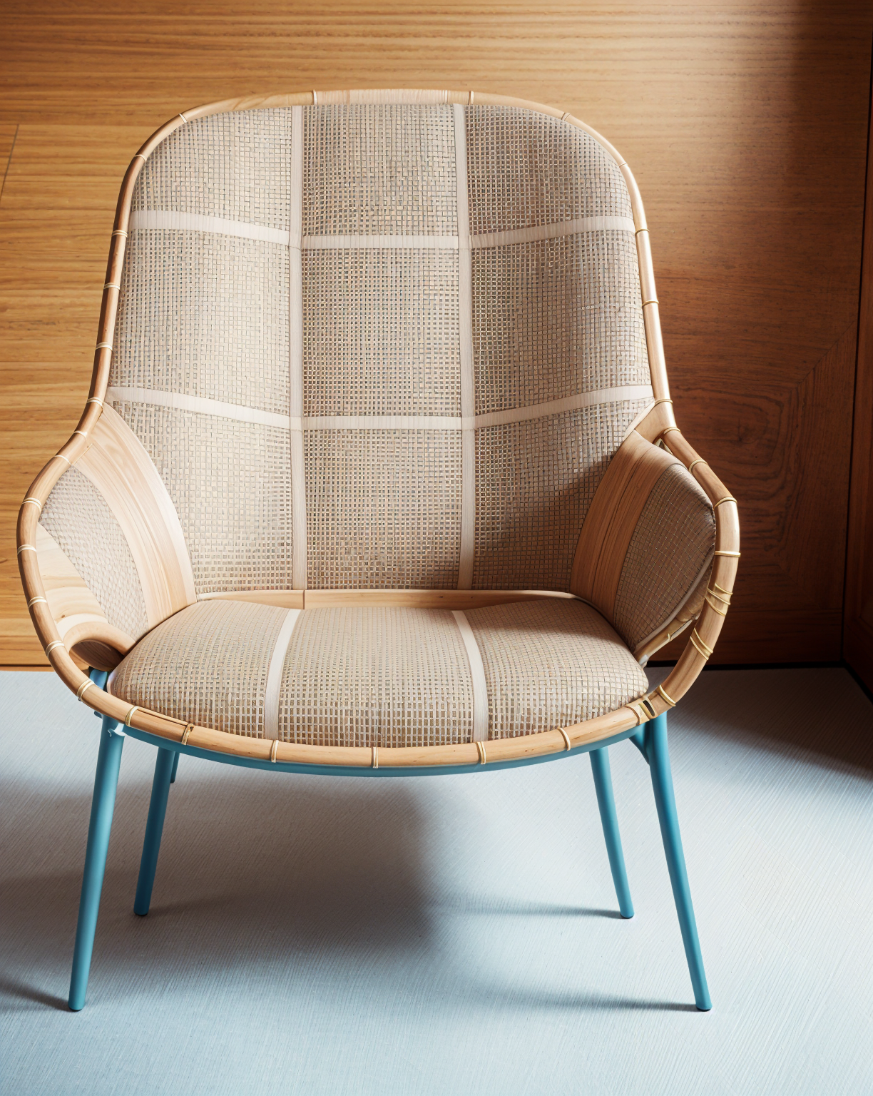 modernist perspective shot upholstered seat and back weaving inspired chair wooden legs finish architecture