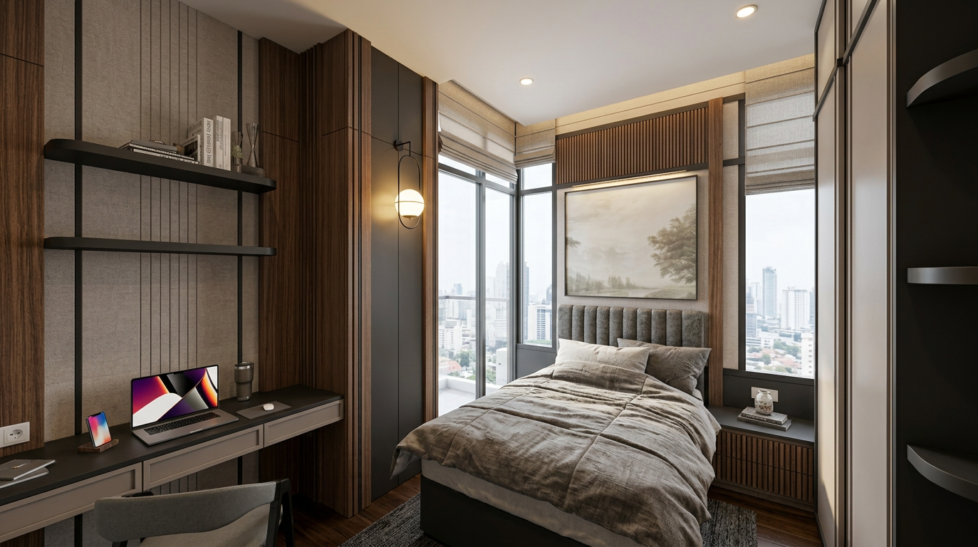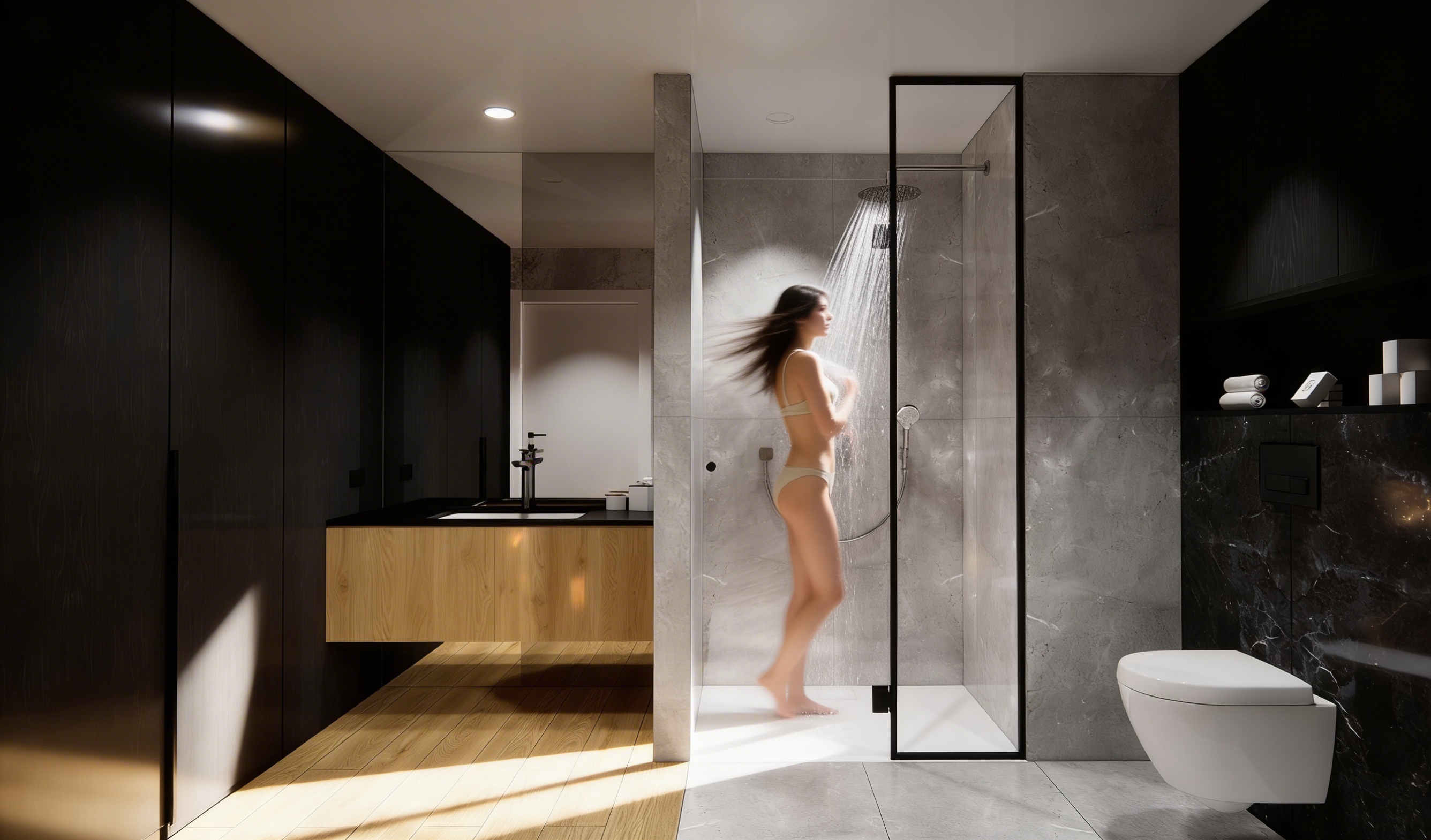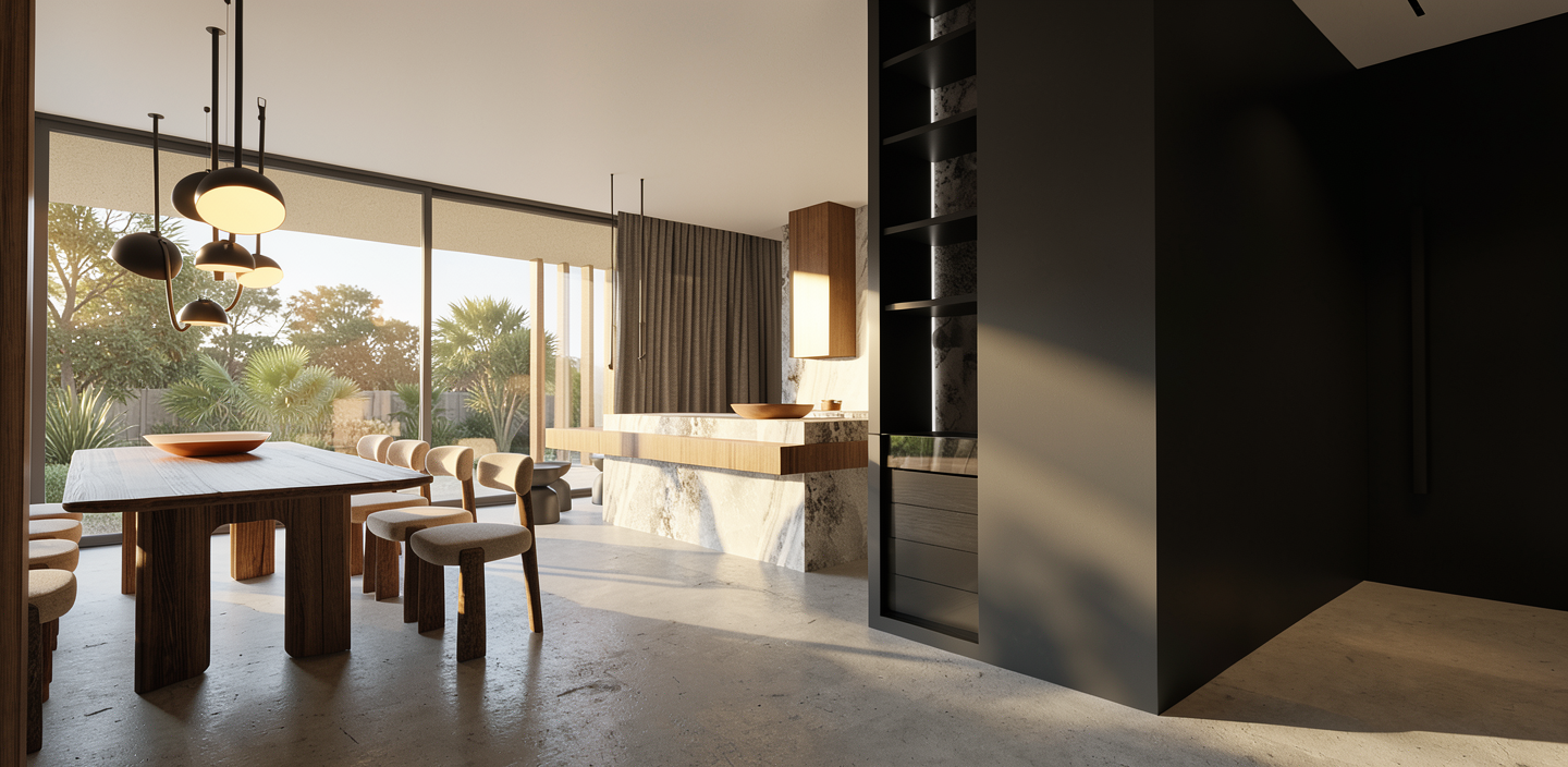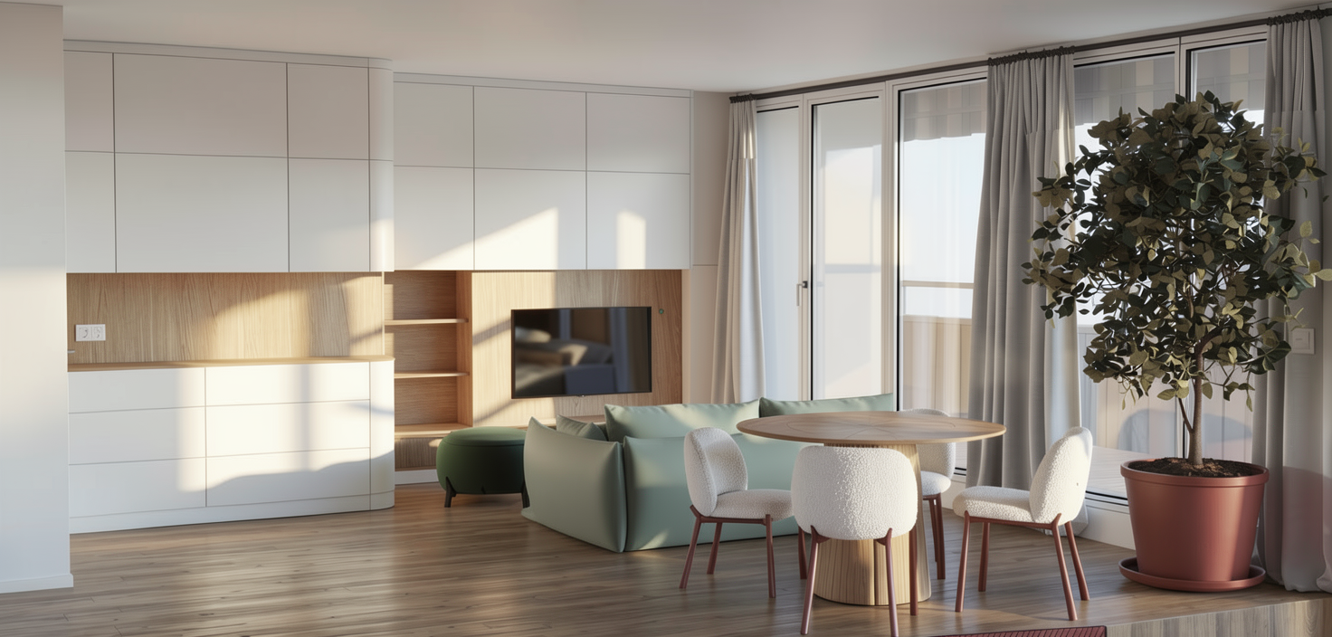 use the provided render strictly as the base image for composition camera angle furniture placement proportions and architecture do not change the layout object positions or room geometry the sofa upholstery must be completely smooth and continuous remove the visible crossing lines compression lines shading seams polygon artifacts or triangulation patterns that currently appear on the sofa surface the sofa fabric should look like soft evenly stretched upholstery without intersecting lines or artificial seams the cushions should appear smooth and naturally rounded with subtle fabric softness the dining table surface must also be clean and smooth without any mesh lines polygon edges or shading artifacts the oak wood texture should appear natural with a subtle wood grain in the tv wall area remove the baseboard floor skirting where the wooden cabinet section with drawers is located the wooden cabinet with drawers should appear floating above the floor there should be a visible gap between the cabinet and the floor and a clear soft cast shadow underneath emphasizing that the cabinet is levitating all materials should appear smooth realistic and free of visible 3d modeling artifacts keep the chalk colored furniture slightly darker with a matte chalk finish maintain the natural oak wood texture with vertical grain direction and keep the white boucl dining chairs with brownish red legs preserve the soft natural sunlight and warm shadows in the interior and focus on improving material realism lighting quality and photorealistic rendering while keeping the original design unchanged