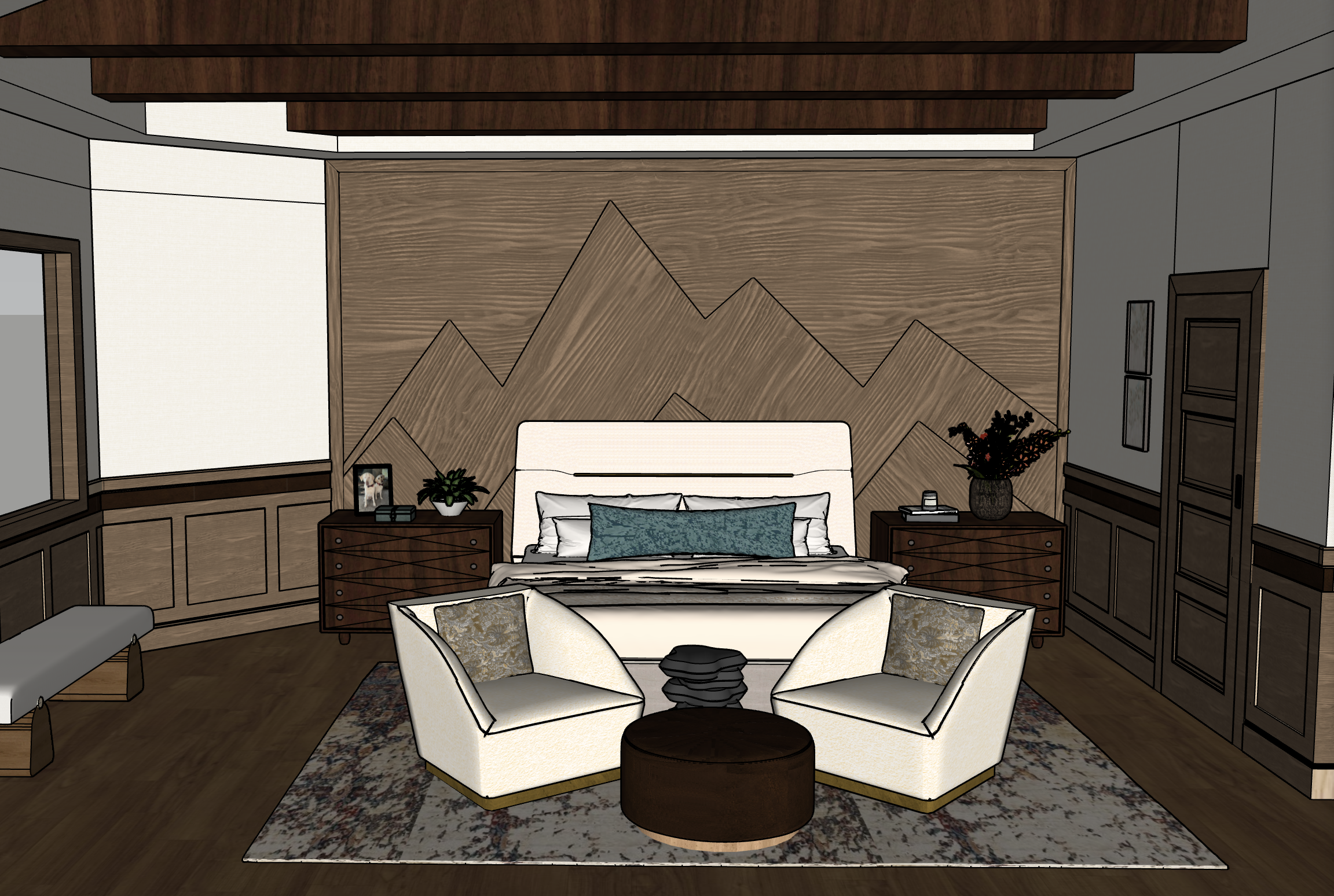 create a luxurious bedroom interior with rich warm tones design a feature wall with a mountain scape that is uplit with led lighting in between each wood panel in medium oak wood position a modern bed with a cream upholstered headboard add teal accent pillows on the bed for contrast include two elegant white lounge chairs with gold details around a dark brown circular coffee table at the foot of the bed place sophisticated dark wooden nightstands on each side of the bed topped with small plants and decorative items use a richly patterned area rug with hints of blue and burgundy under the chairs let soft natural light illuminate the room casting gentle shadows