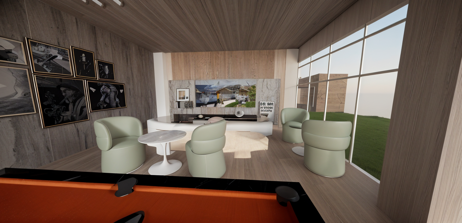 contemporary exterior shot make it look photo realistic keep original colors and architecture maintain original building finishes and design shapes show dark black asphalt on all streets show centre street lane lines show grass beside left curb show modern interiors behind glass maintain all buildings in the same design styles from original image large trees behind all buildings show glass windows and glass balcony railings grass along road curb sidewalks on both side of the street 3 feet of grass between the sidewalks and the curbs architecture