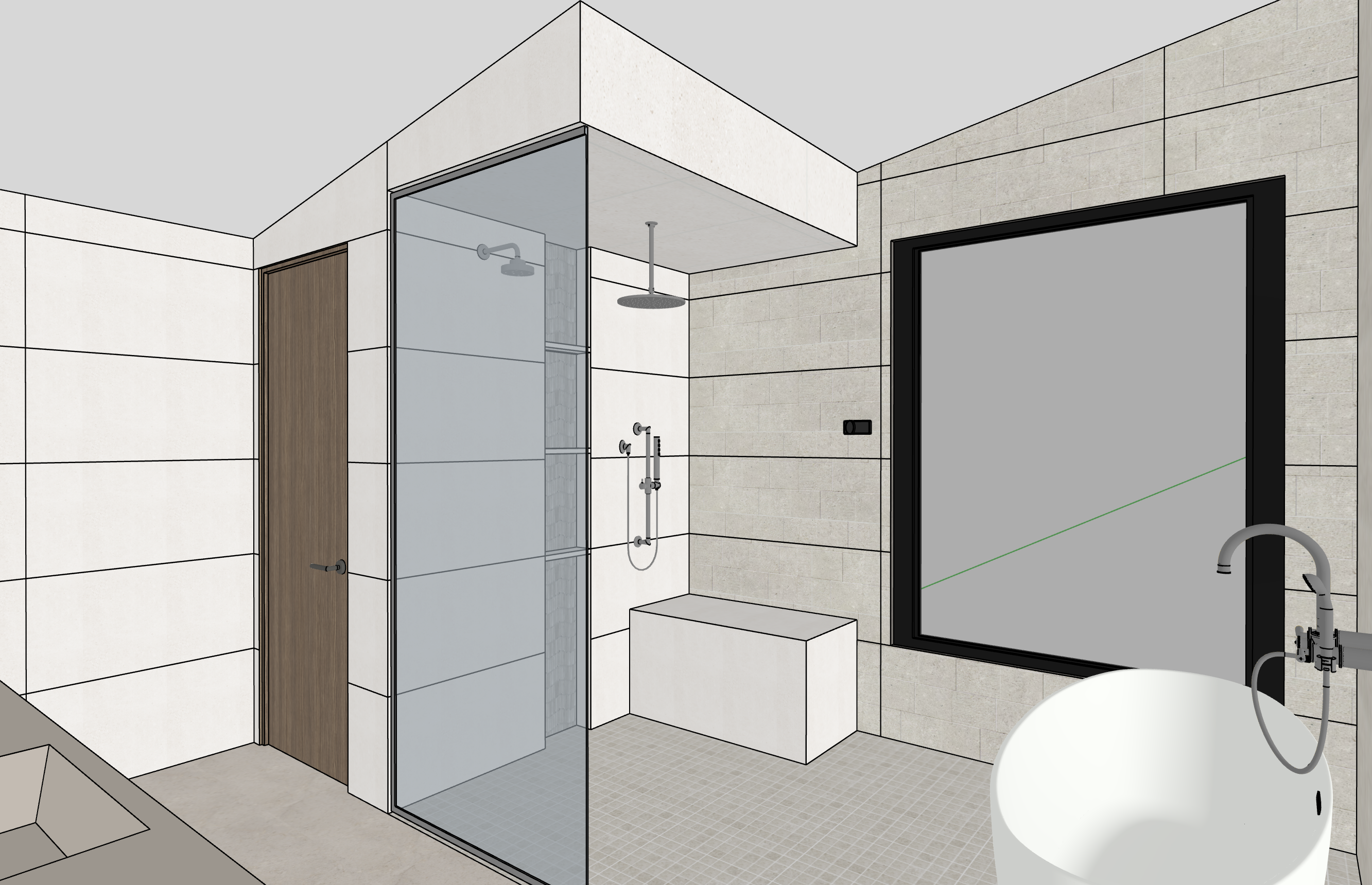 the tile on the back wall should be lighter the view outside the window should be trees and mountains in the distance the shower glass should be clear and not have any water the floor tile should be light and creamy in color