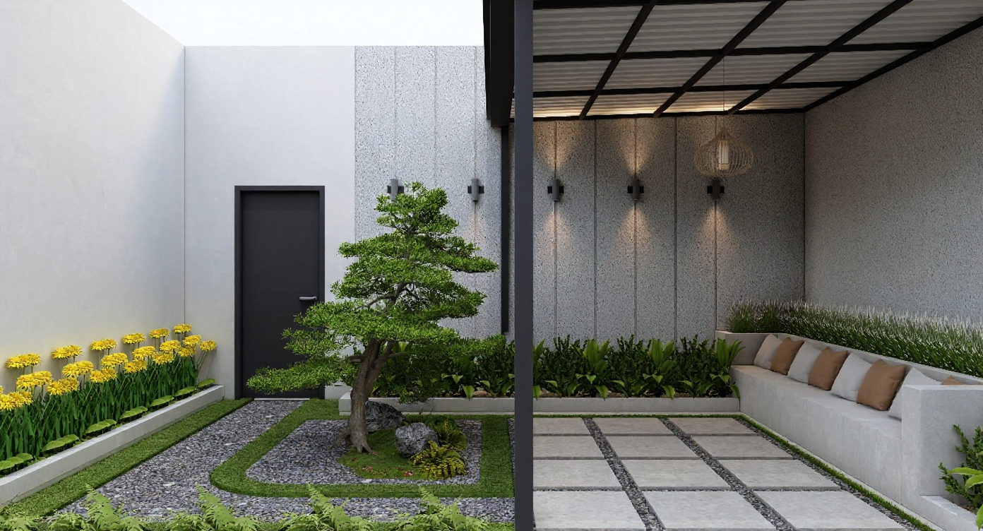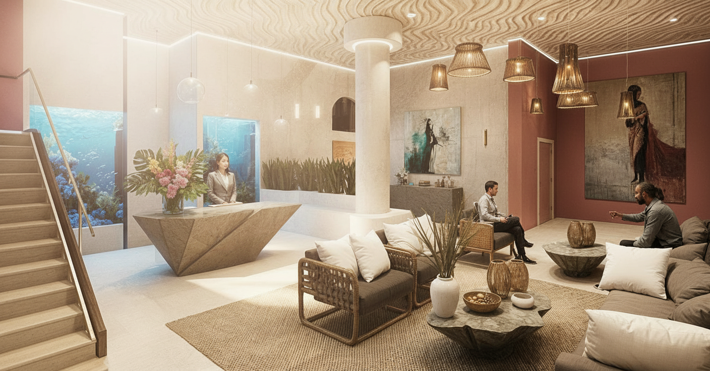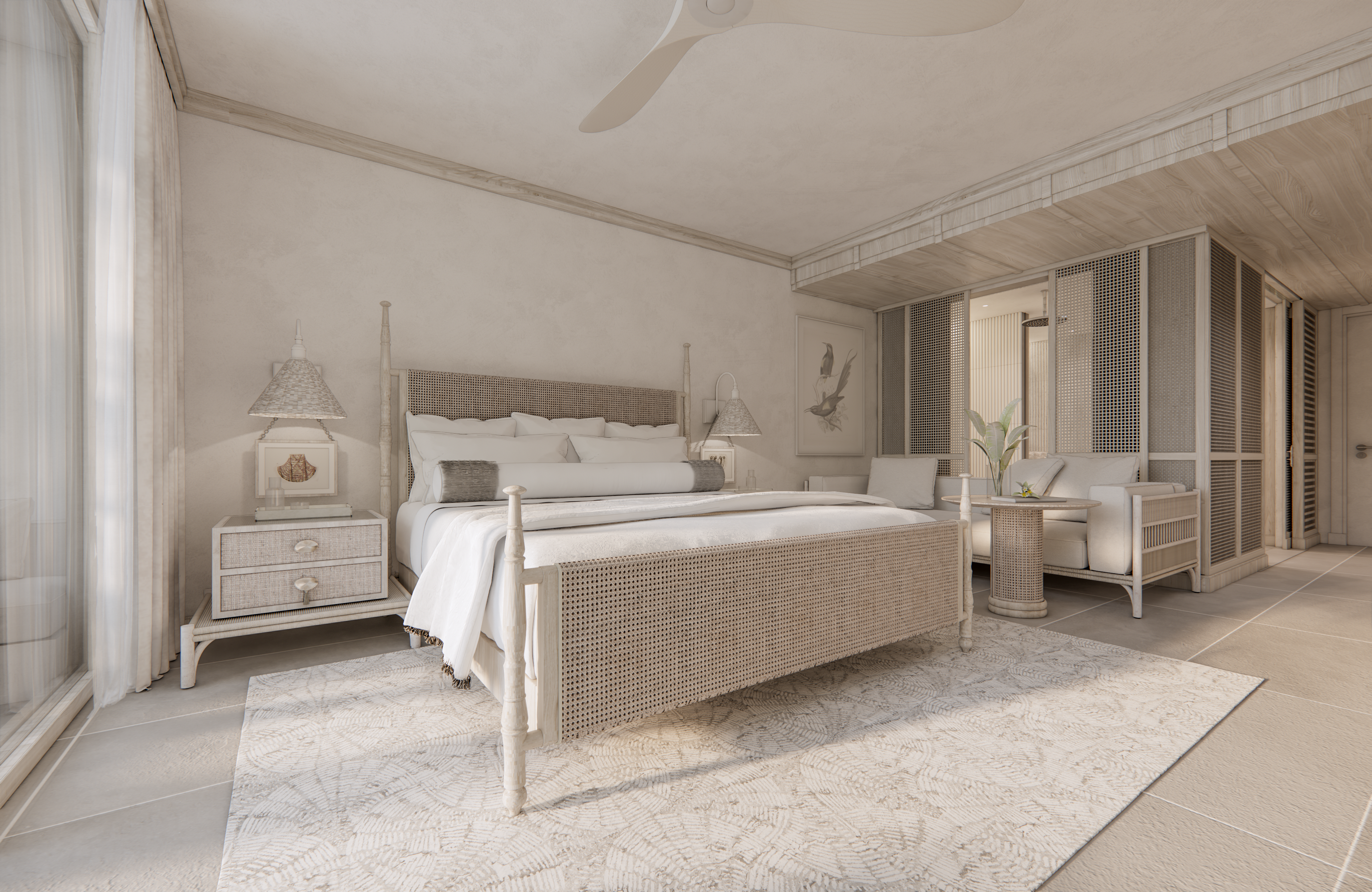 maintain the exact existing camera angle spatial proportions furniture placement architectural forms and model geometry do not alter layouts shapes or dimensions only apply refined finishes materials textures and lighting to produce a high end finished interior render flooring honed light limestone flooring with subtle natural stone variation soft tonal movement matte finish walls joinery louvre walls and lower bulkhead in light teak timber with a refined warm natural grain main ceiling finished in clean matte white furniture finishes sofa frame bed frame and bedside table bases in a bamboo toned wood finish sofa upholstery remains neutral but with enhanced fabric texture and softness bed headboard and bed end panel in a light pale rattan finish airy and woven in appearance textiles bedding in crisp white two smaller elongated pillows in soft terracotta fabric with taupe fringe detailing sofa cushion in a soft palm leaf green tone area rug retains its existing pattern primarily neutral tones with occasional subtle terracotta accents woven through the design lighting bold hawaiian golden hour lighting warm luminous and glowing yet still fresh and refined strong warm sunlight filtering from the bathroom and hallway visibly passing through the central two screen panels ambient lighting present in both hallway and bathroom spaces wall sconces turned on with natural rattan shades emitting a warm soft glow that enhances texture and materiality throughout the room overall mood relaxed luxury tropical modern warm and inviting high end residential interior with natural materials balanced warmth and cinematic golden hour light render style photorealistic interior visualization soft shadows natural reflections high material realism editorial quality lighting
