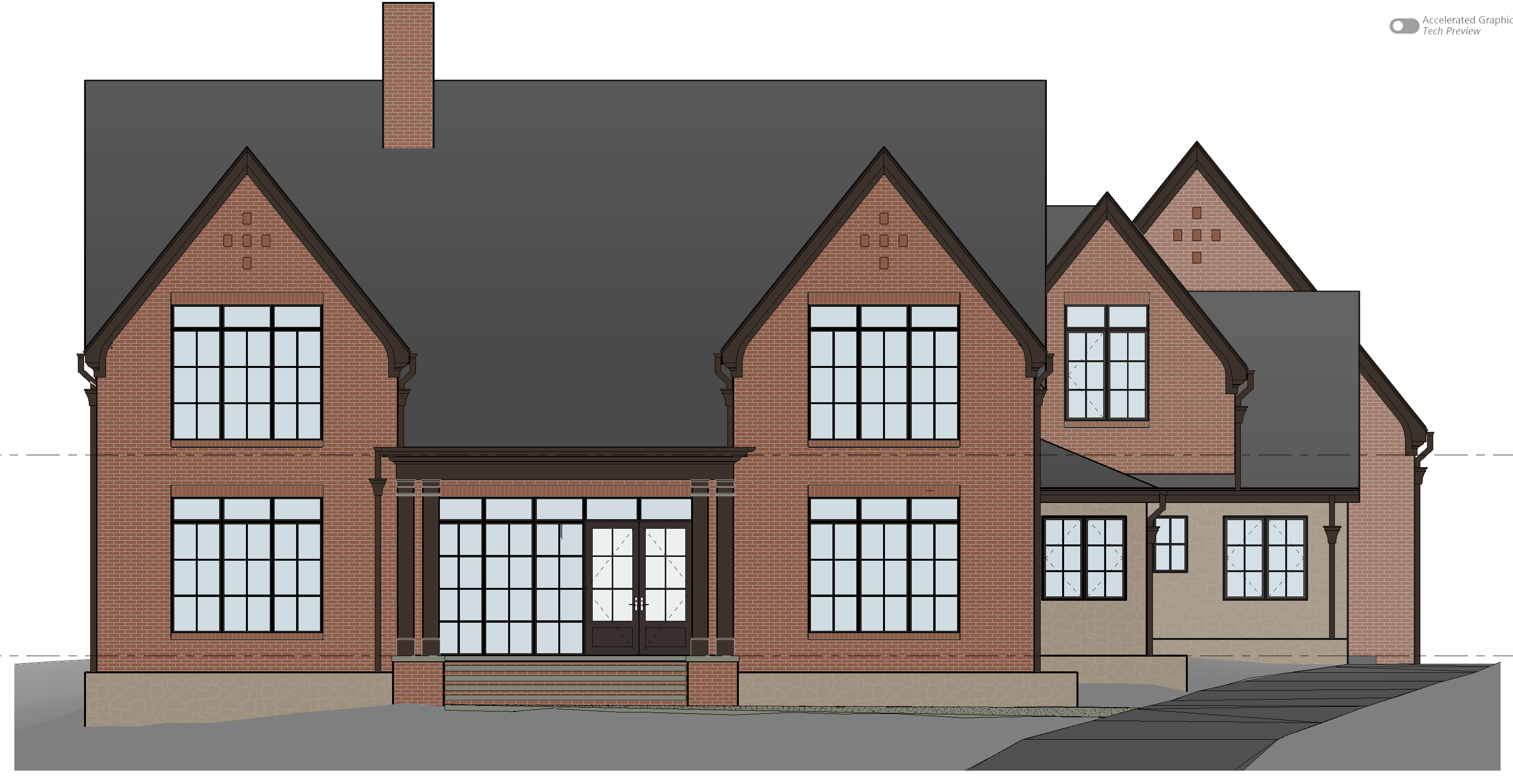 make a rendered elevation with old red brick and grey tennessee flagstone add bushes to the raised gardens and make the front slope have grass