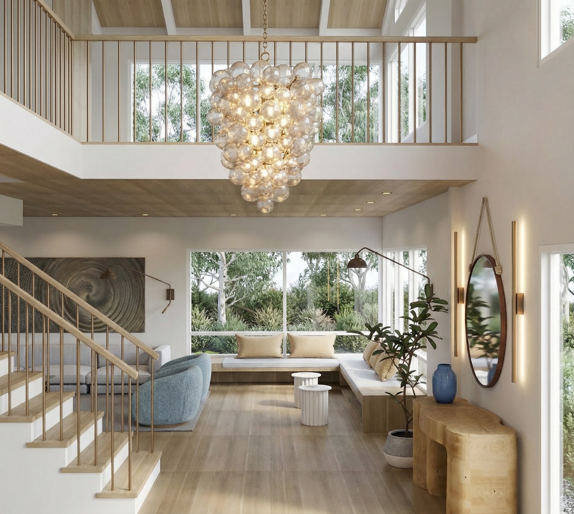 create photorealistic rendering of this entry and living area add white partition wall underneath handrailing that comes up about 4 short of bottom of handrail remove additional bottom stairs at left make linear lights 2 3 size they are currently