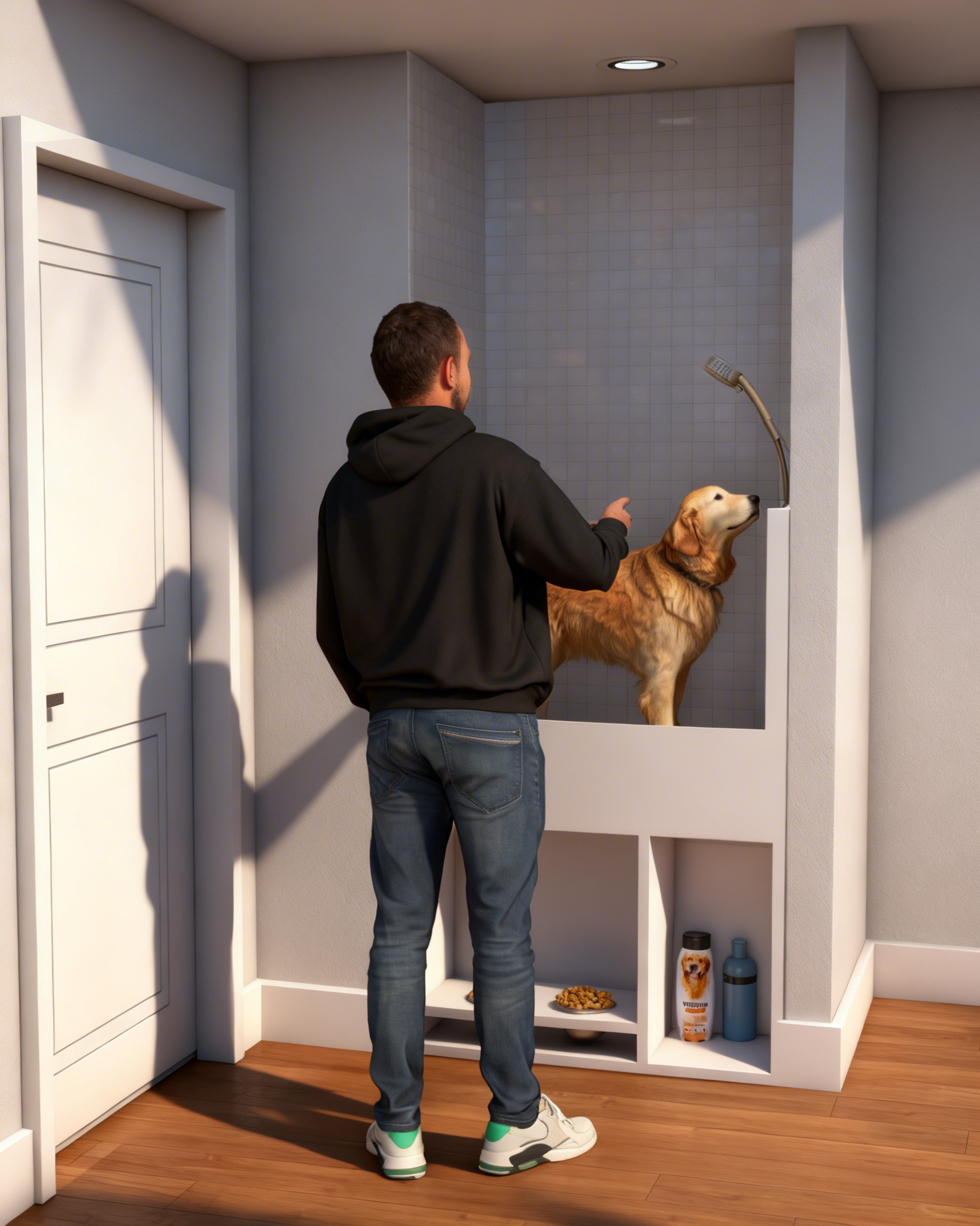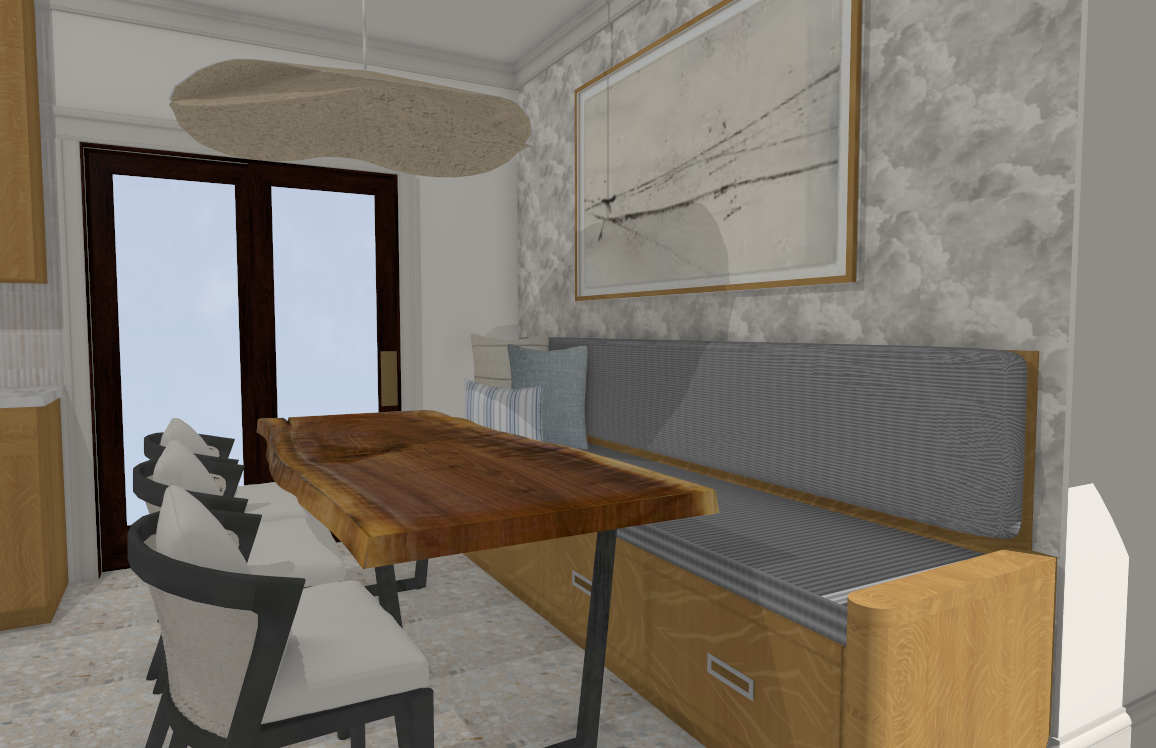 maintain the exact layout dimensions and placement of all elements do not change materials colors or geometry additionally apply a very subtle hand drawn architectural sketch overlay faint pencil line edges around furniture silhouettes cabinetry and key architectural elements as if barely sketched over the photograph keep it extremely subtle the photorealistic image must remain fully dominant