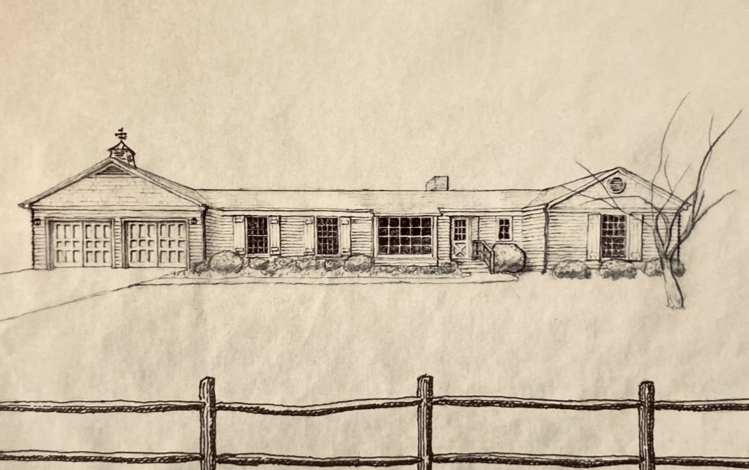add copper round down spouts warm white siding cedar shake shingles in gable peaks in warm white copper cupola olive green shutters grayish shingle roof cottage looking garage doors spring landscaping and trees