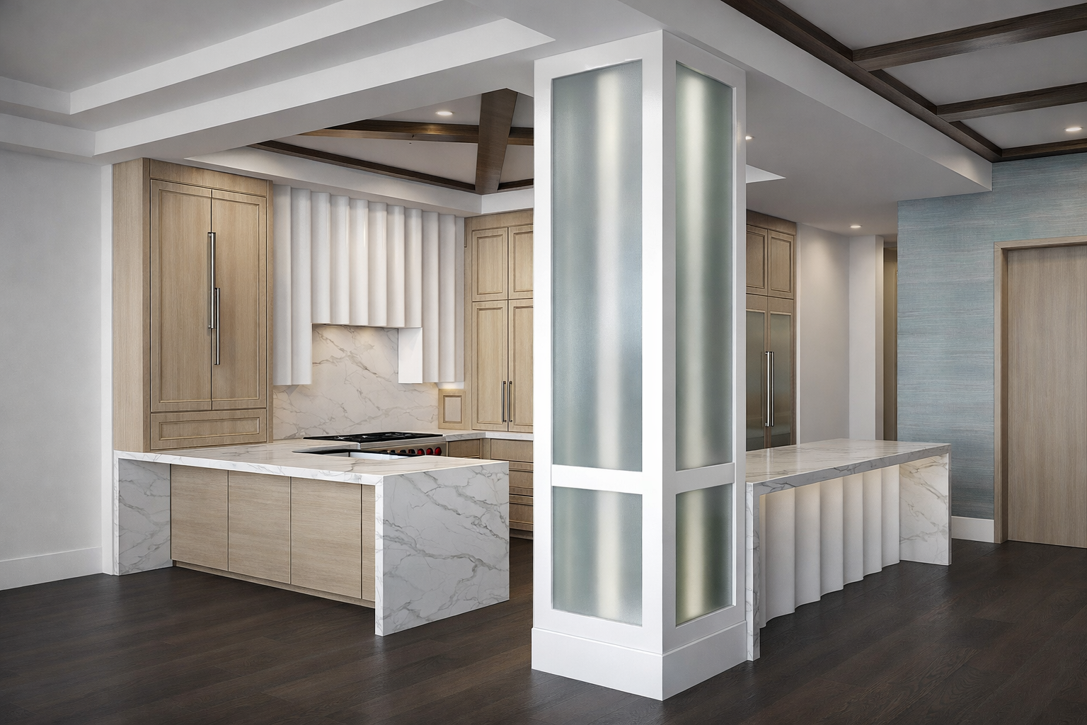 transform the provided elevation into a hyper realistic interior photograph that is indistinguishable from a real professionally shot interior design photograph this must read as a real space captured by a camera not a rendering not a visualization not architectural cg not concept art and not an illustration geometry lock non negotiable preserve the exact original geometry layout proportions ceiling details wall depths panel divisions openings doors cabinetry locations millwork dimensions built ins and circulation paths with zero architectural changes nothing may move scale simplify or be reinterpreted geometry must remain absolutely unchanged camera derivation critical derive the camera position height angle and framing strictly from the uploaded elevation eye level interior photography centered or naturally balanced composition 24 35mm interior lens feel no dramatic angles no stylized framing do not reuse or approximate camera framing from any previous image remove all drawing artifacts completely remove all linework cad edges drafting outlines diagrammatic shapes sketch artifacts nothing may appear outlined flat schematic or illustrative the elevation must be visually reinterpreted as a finished real interior photograph material realism rules wood if present smooth solid plank material extremely subtle restrained grain matte or soft satin finish only no graphic patterns no decorative striping no visual noise wood must absorb light gently never glossy or sharp fabric upholstery if present soft compression subtle seams gentle shadowing natural fabric texture no flat color blocks stone slabs if present light natural veining soft organic variation low contrast no symmetry no bold or busy patterns stone must feel heavy and grounded walls fine surface texture slight tonal variation never flat paint edge construction realism all edges corners joints and transitions must be softly broken and physically realistic no razor sharp corners no cgi perfect edges slight construction tolerances only everything must read as fabricated installed and dimensional lighting photographic behavior lighting must behave like real high end interior photography natural daylight only unless otherwise specified realistic light bounce gentle shadow falloff uneven exposure distribution subtle brightness variation across surfaces avoid studio lighting uniform illumination over clean exposure global illumination look slight softness is preferred over sharpness camera image imperfections very important introduce subtle photographic characteristics gentle lens softness micro exposure variation natural contrast roll off mild atmospheric depth primary plane sharp background slightly softer the image must feel captured not generated absolute constraints no creative interpretation no stylization no exaggeration no added or removed elements any deviation from the original elevation geometry or intent is unacceptable negative prompt always include architectural rendering 3d visualization cgi unreal engine octane vray sketchup look flat textures graphic lines outlined edges over sharpened studio lighting concept art illustration ai look plastic materials glossy wood high contrast grain perfect symmetry keep design as shown in the picture keep the design as it is in image light cabinets are white and brown cabinets are white oak keep design in the image as it is