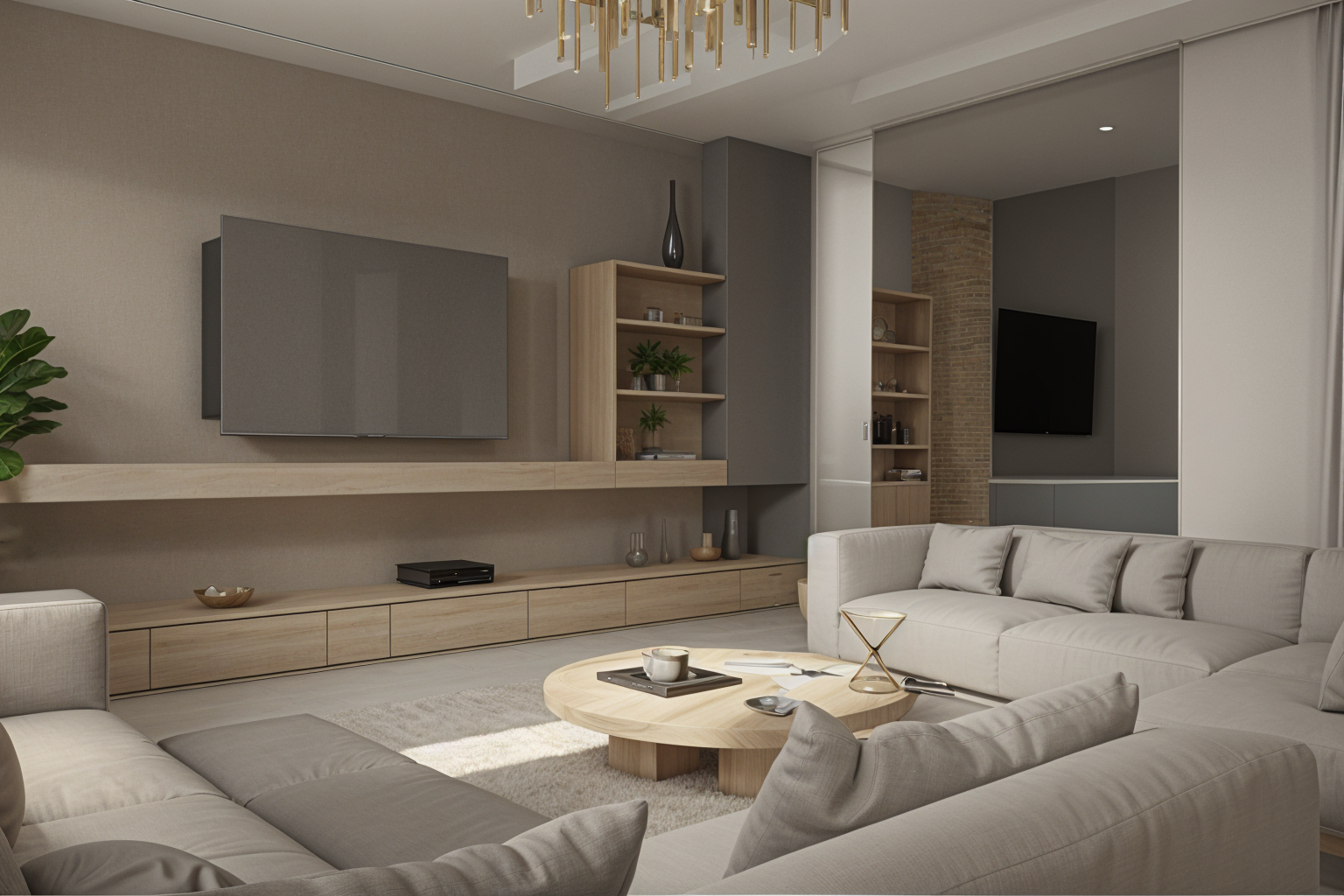 modernist interior shot render a luxurious living room with a modern minimalist design use soft beige and cream tones for the walls and floors and incorporate sleek contemporary furniture in shades of taupe and grey the large sectional sofa should be upholstered in an elegant light grey fabric add plush throw pillows in muted teal and mustard yellow for a pop of color the round coffee table should be a smooth polished wood in a rich walnut finish shelves on the wall hold a variety of decorative items like vases and modern art pieces in matte black and brushed gold the large window on the right lets in ample natural light creating a warm and inviting atmosphere a chic chandelier in the center of the room adds a touch of sophistication overall the atmosphere is cozy elegant and serene architecture