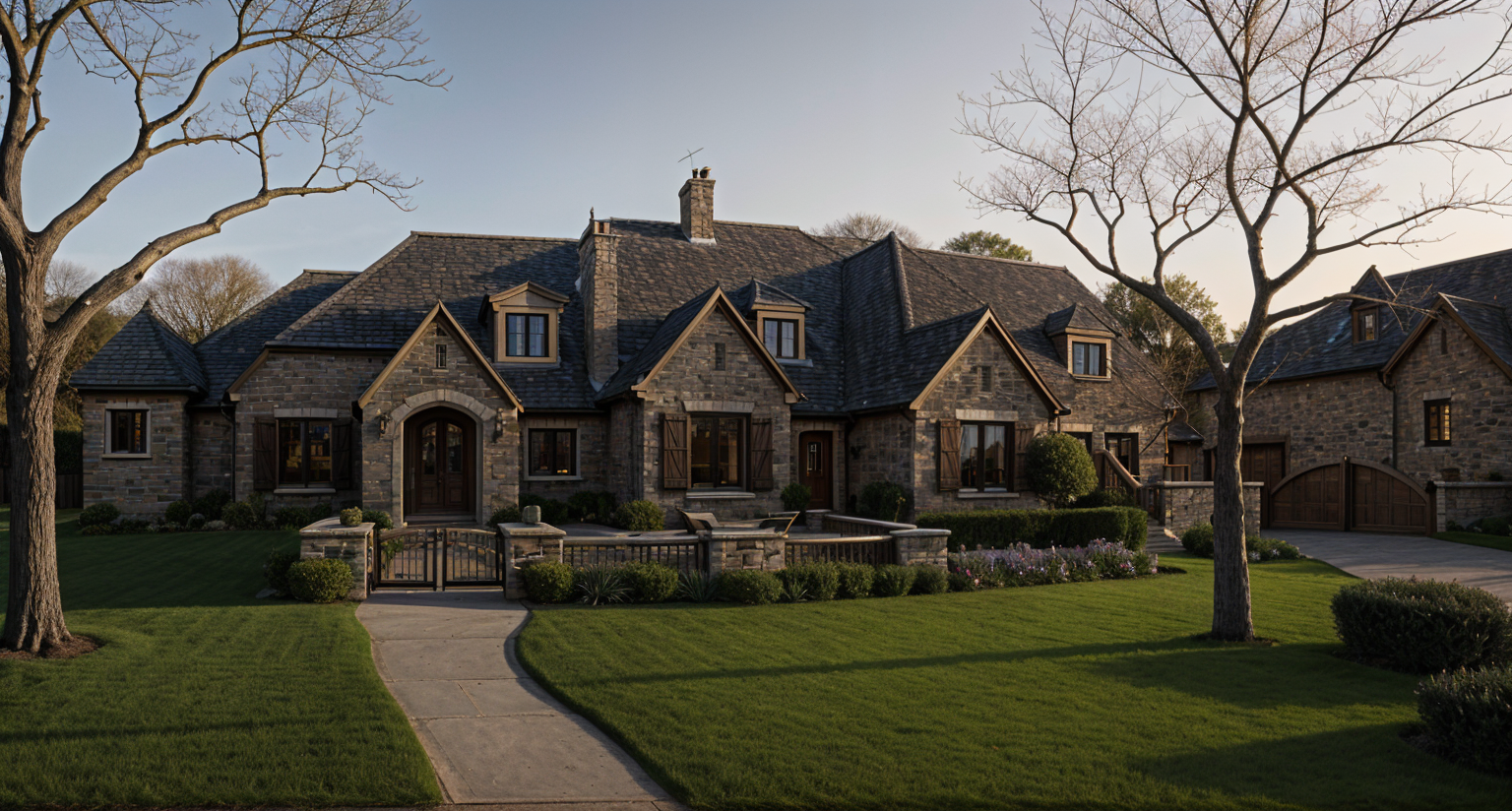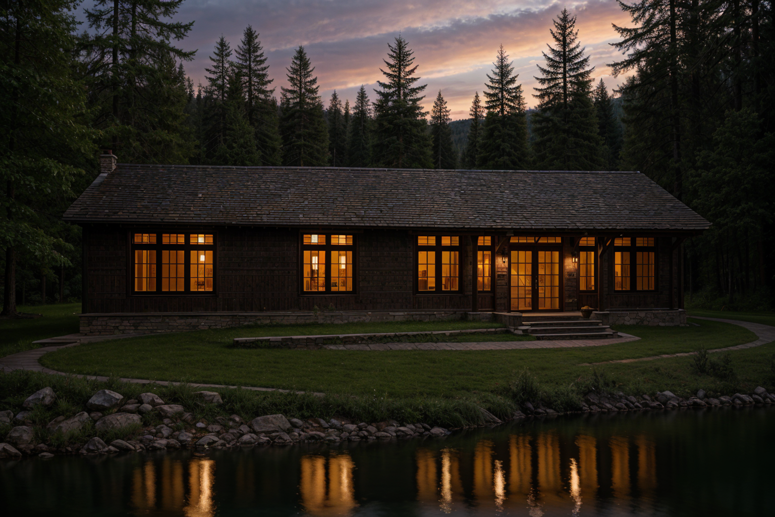 gray cedar shingle siding with gray trim modern stone base with ferns around it southern pine forest at sunset in background lake shore in foreground dark window mullions and trim bright light through window and door glass panes