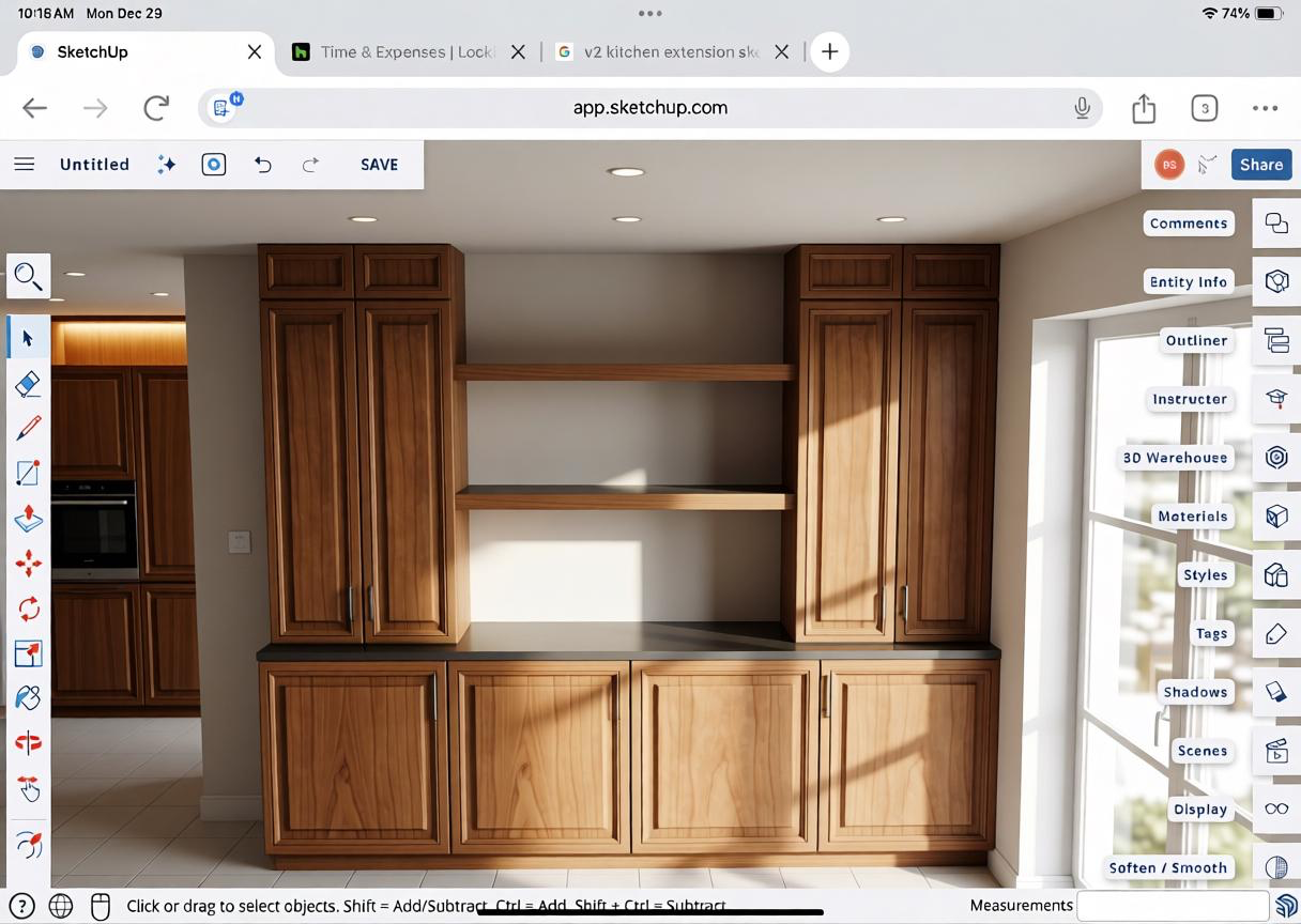 replace the window with just a solid wall also make the countertop white calcutta marble and add track lighting to each shelf