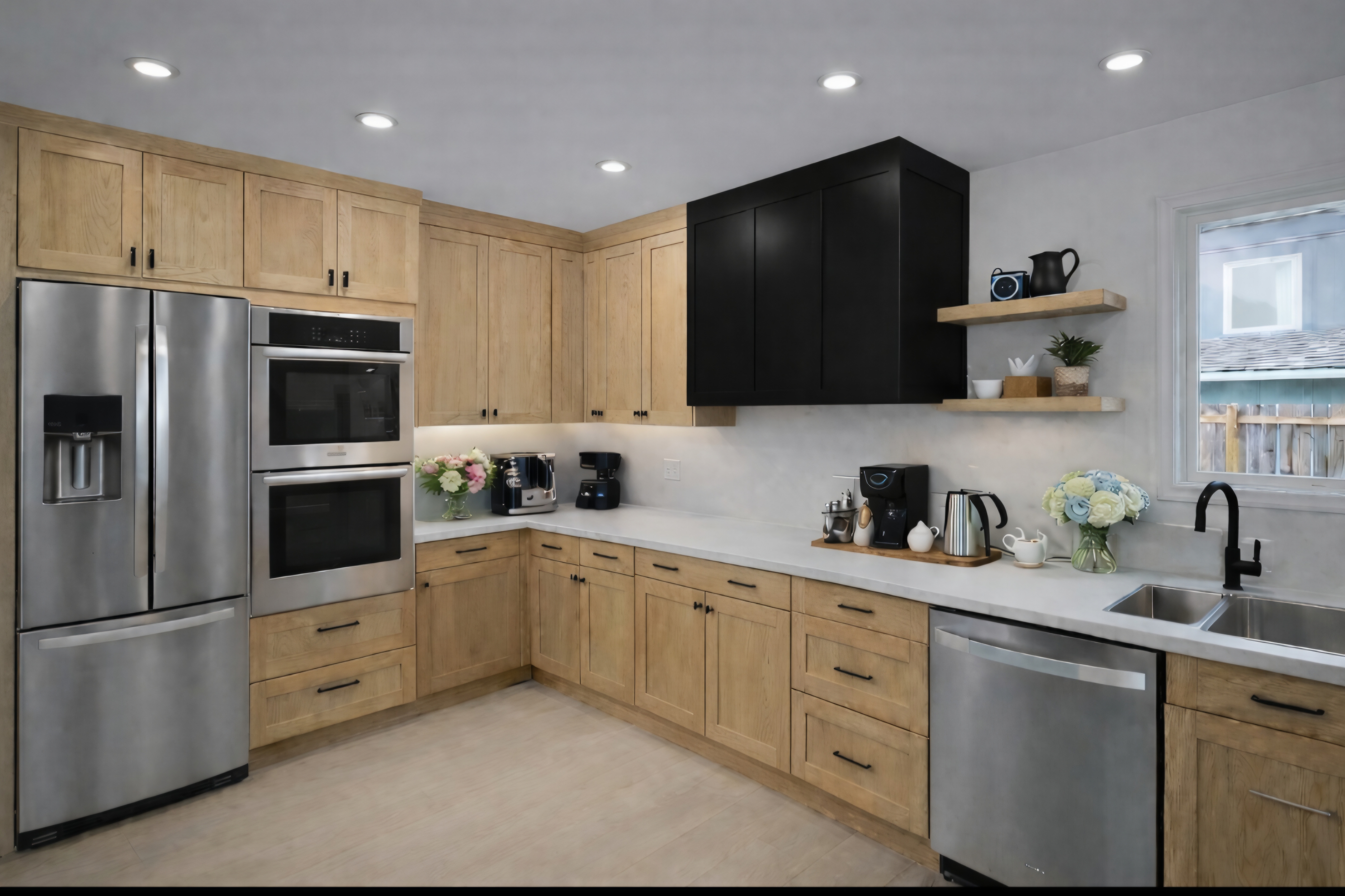 remove the double oven and replace with a cooktop add about a 24 cabinet between the fridge and cooktop