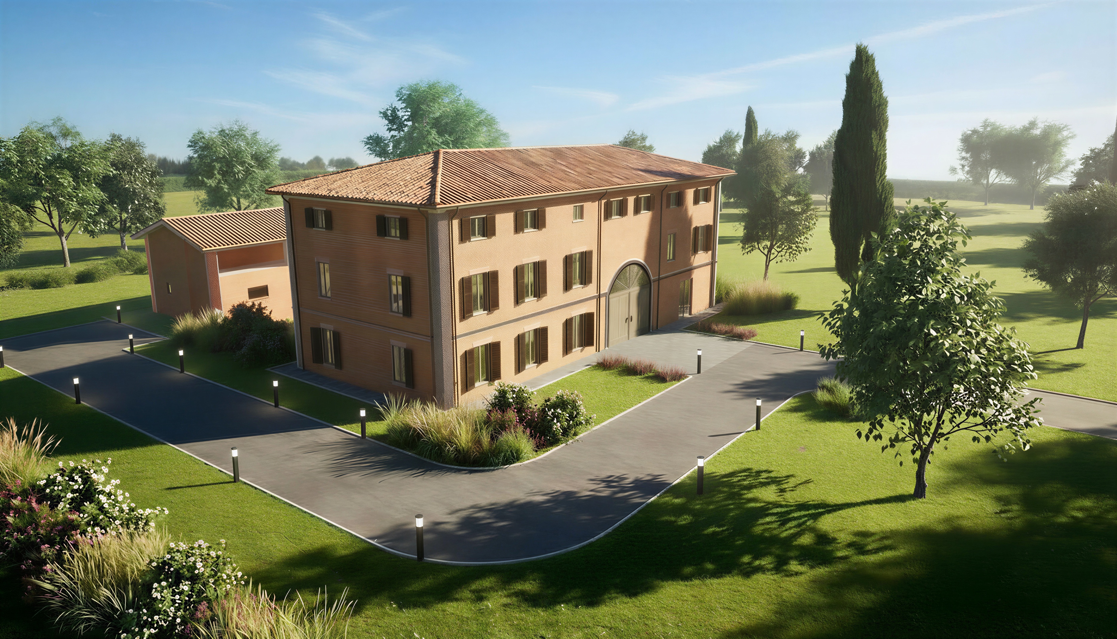 house in a lush countryside setting during a clear sunny day render a large two story house with terracotta walls and a tiled roof situated in a vast green lawn the sky is bright blue with soft wispy clouds creating a serene and welcoming atmosphere surround the house with diverse trees and bushes varying shades of green include a paved road in dark gray with clean and soft edged lighting poles evenly spaced along it incorporate natural shadows and highlights to emphasize the tranquil and picturesque scene