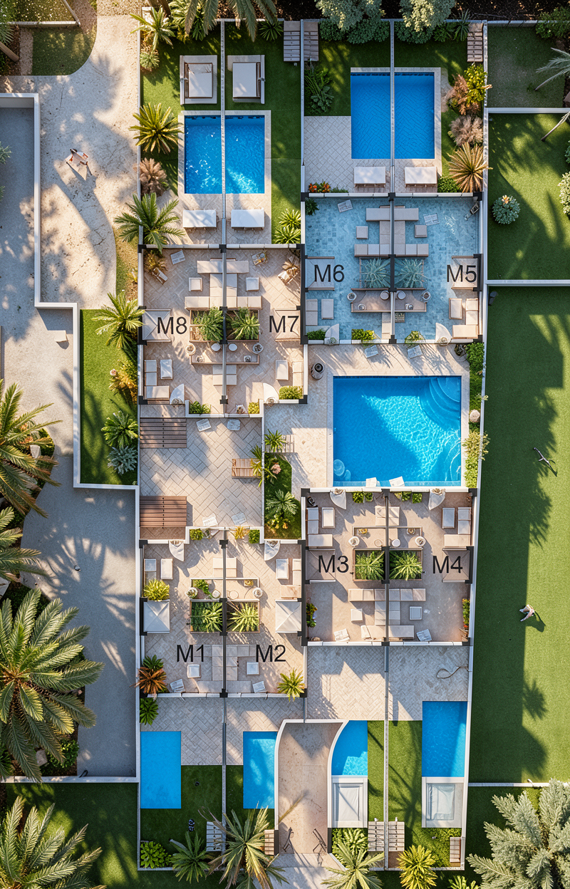 make the plan look nice make swimming pools only in the blue lines area keep the interior without water and plants vegetation