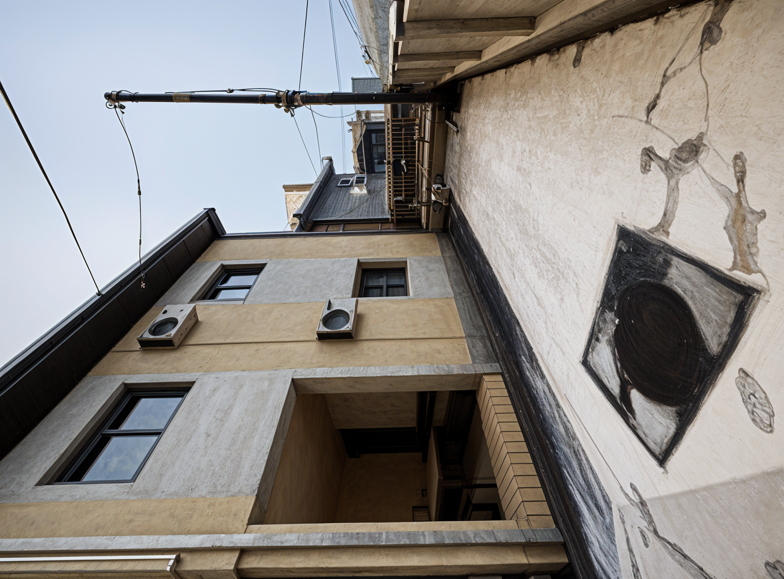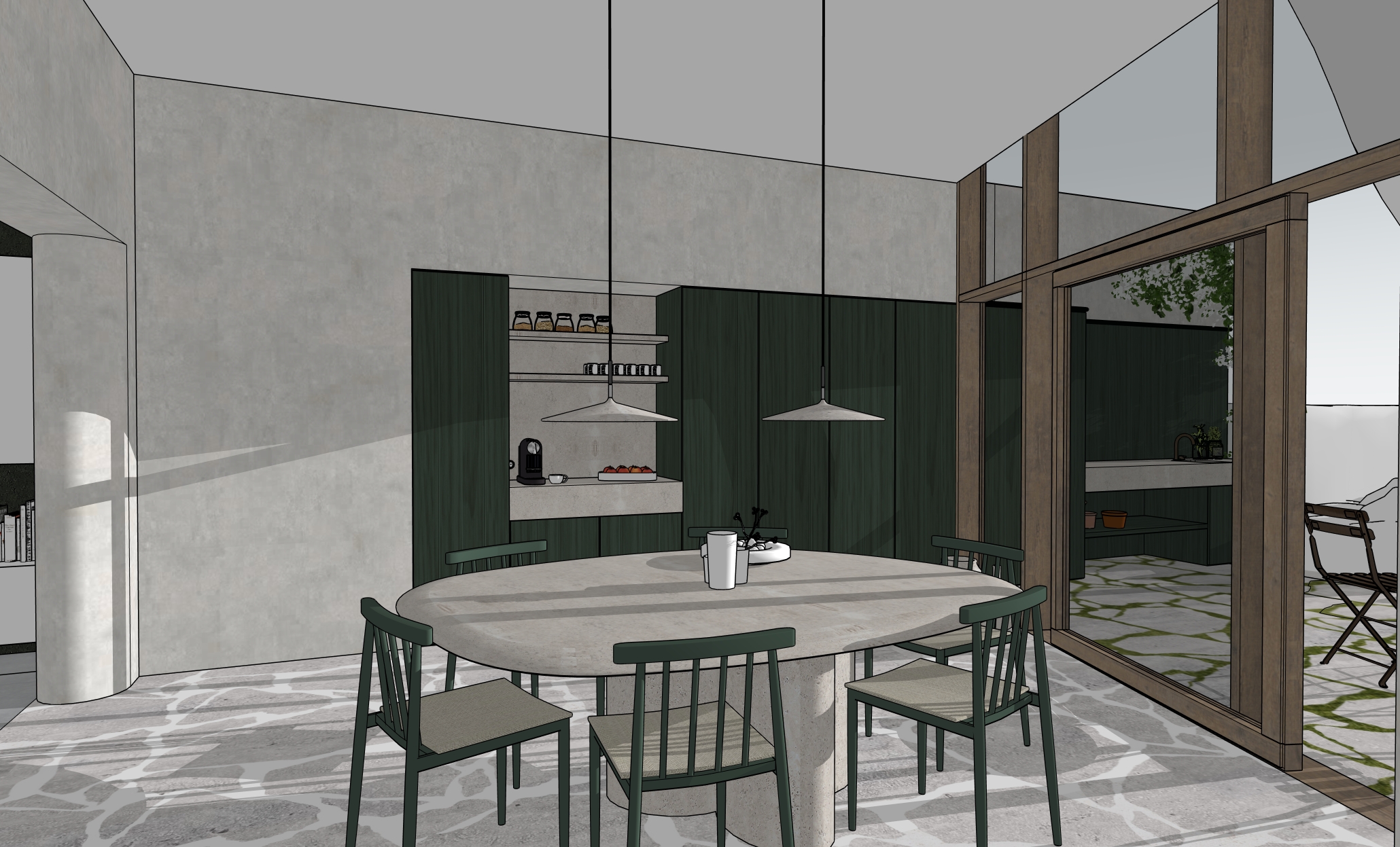 a warm and atmospheric interior scene featuring a cabinet wall made of washed green stained wood the cabinet wall incorporates a coffee corner with open shelves the floor is composed of natural stone flagstones with a slightly irregular texture preserve all original materials and the existing composition soft warm lighting enhances the mood creating a cozy and inviting atmosphere high end interior design realistic materials natural color balance subtle shadows elegant and timeless styling