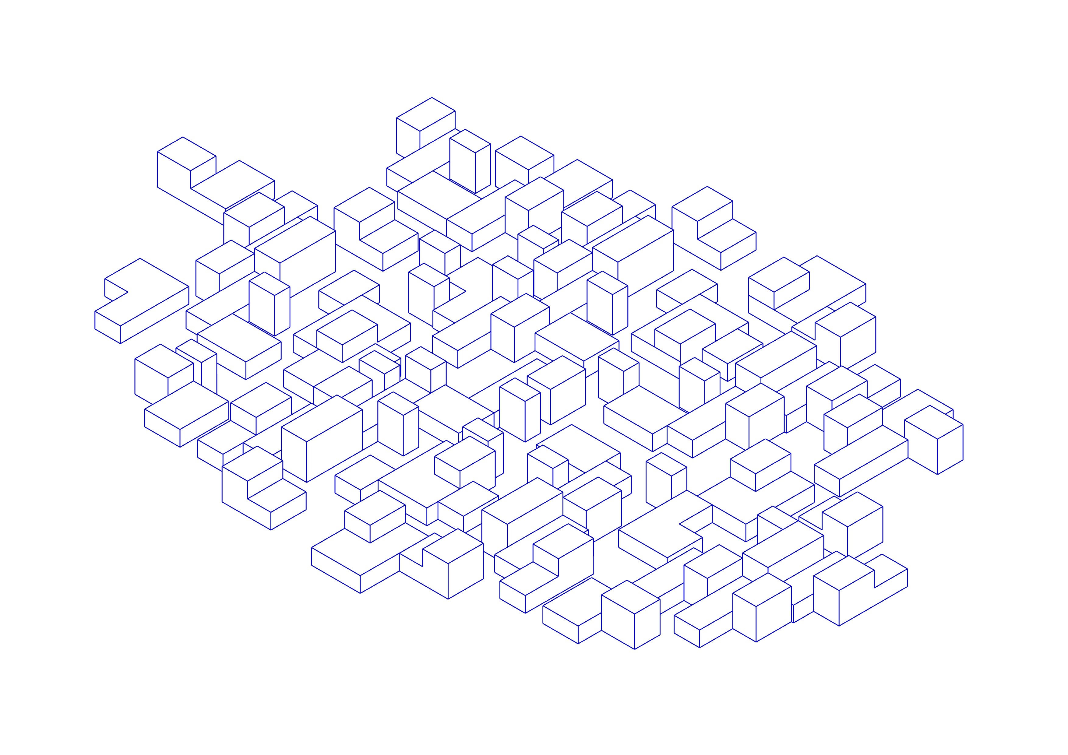 transform this abstract volumetric diagram into a dense inhabited informal settlement introduce strong irregularity in the volumes varied heights misaligned blocks cantilevered extensions and incremental additions add elements of inhabitant appropriation such as lightweight metal roofs tarpaulins reed screens improvised terraces external staircases small balconies and spontaneous extensions vary materials exposed brick partially finished plaster unfinished surfaces patched walls integrate signs of everyday life hanging laundry water tanks domestic objects and small vegetation create a compact dense fabric with narrow and irregular circulation paths maintain an isometric view but make the drawing more expressive less regular and more lived in