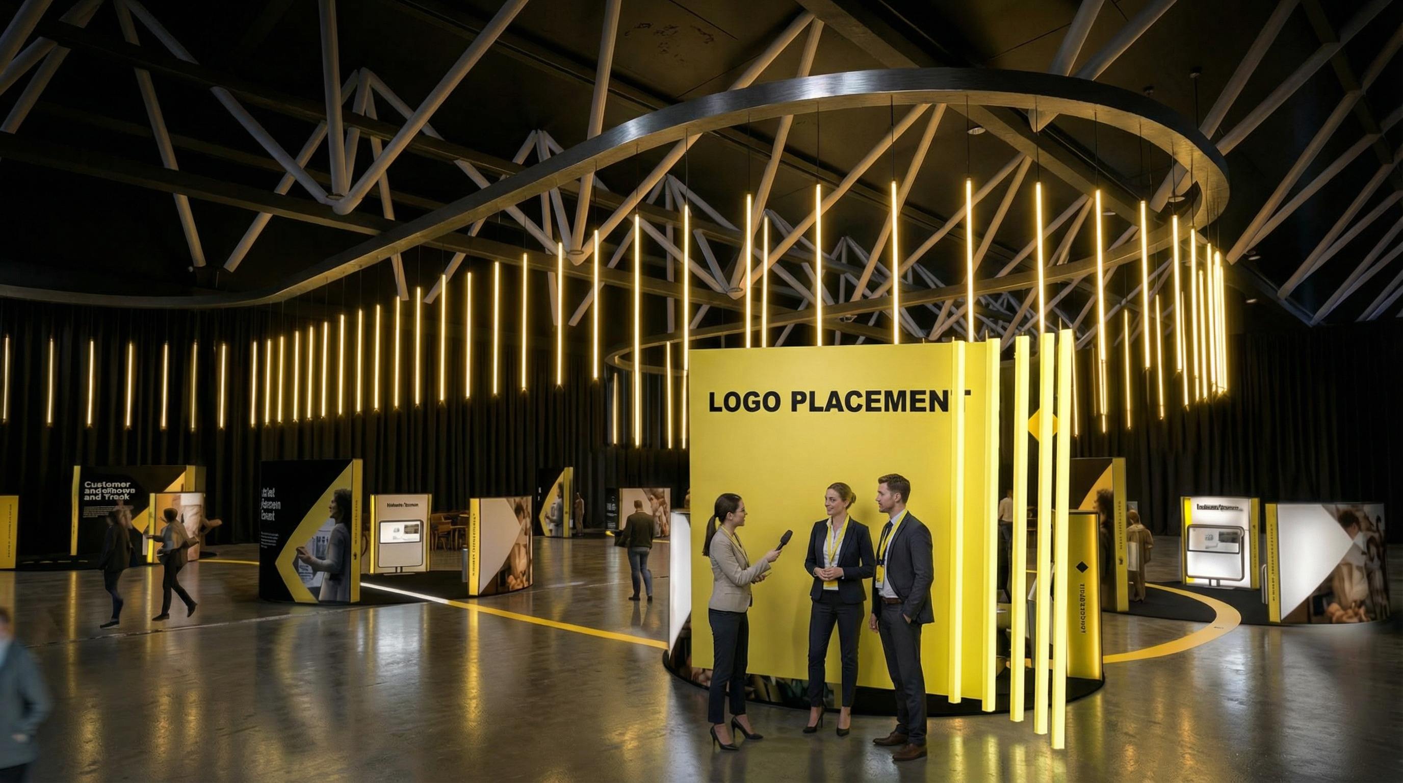 immersive stage environment with light tubes background is in the distance remove floating led tube lights on the ceiling interviewer interviewing two business people with yellow lanyard both standing in front of the wall