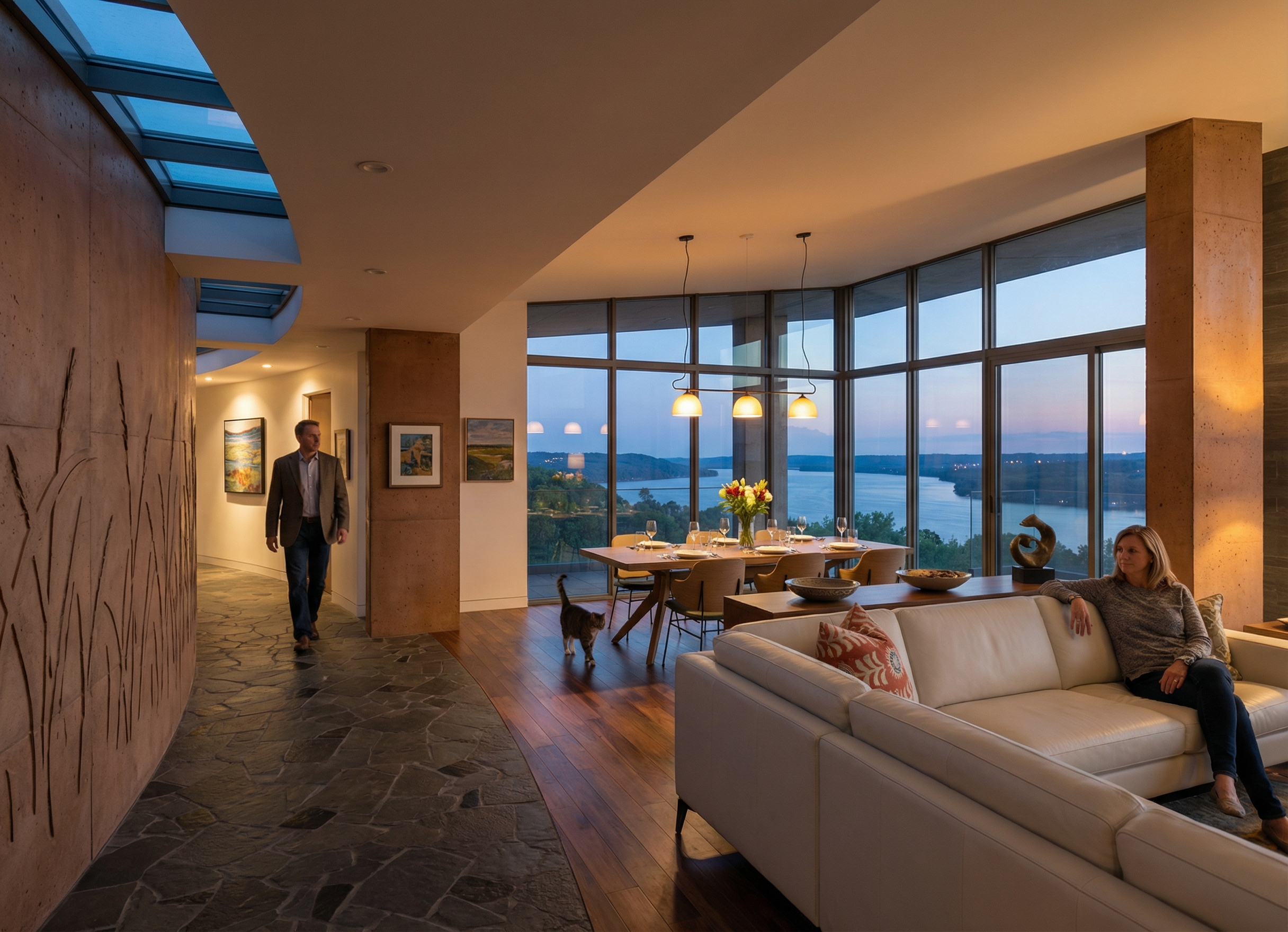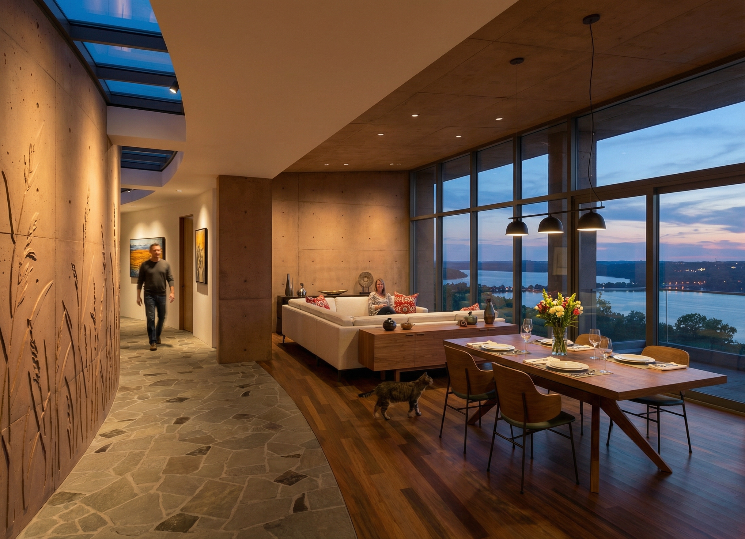 night view with some small lights from boats on the lake add some lights in the far distance coming from houses make the view out of the windows of lake pepin from a high elevation use site cast concrete for the main house material with a natural warm clay color add some abstracted prairie grass patterns in bas relief with a natural warm clay color to the curved site cast concrete wall on the right side of the view cast light on the curved wall at the right side of the view from the recessed lights add table settings and flowers in a vase to the dining room table add a man walking along the curved corridor towards the camera add a woman sitting on the sofa add some accessories on the credenza add light coming from the pendant lights over the dining table add three framed black and white photos on the left wall of the corridor add a cat walking through the dining room use the materials in the original view for reference in this rendering hit the painting on the wall to the right side of the bar stool with light add a woman sanding in the kitchen