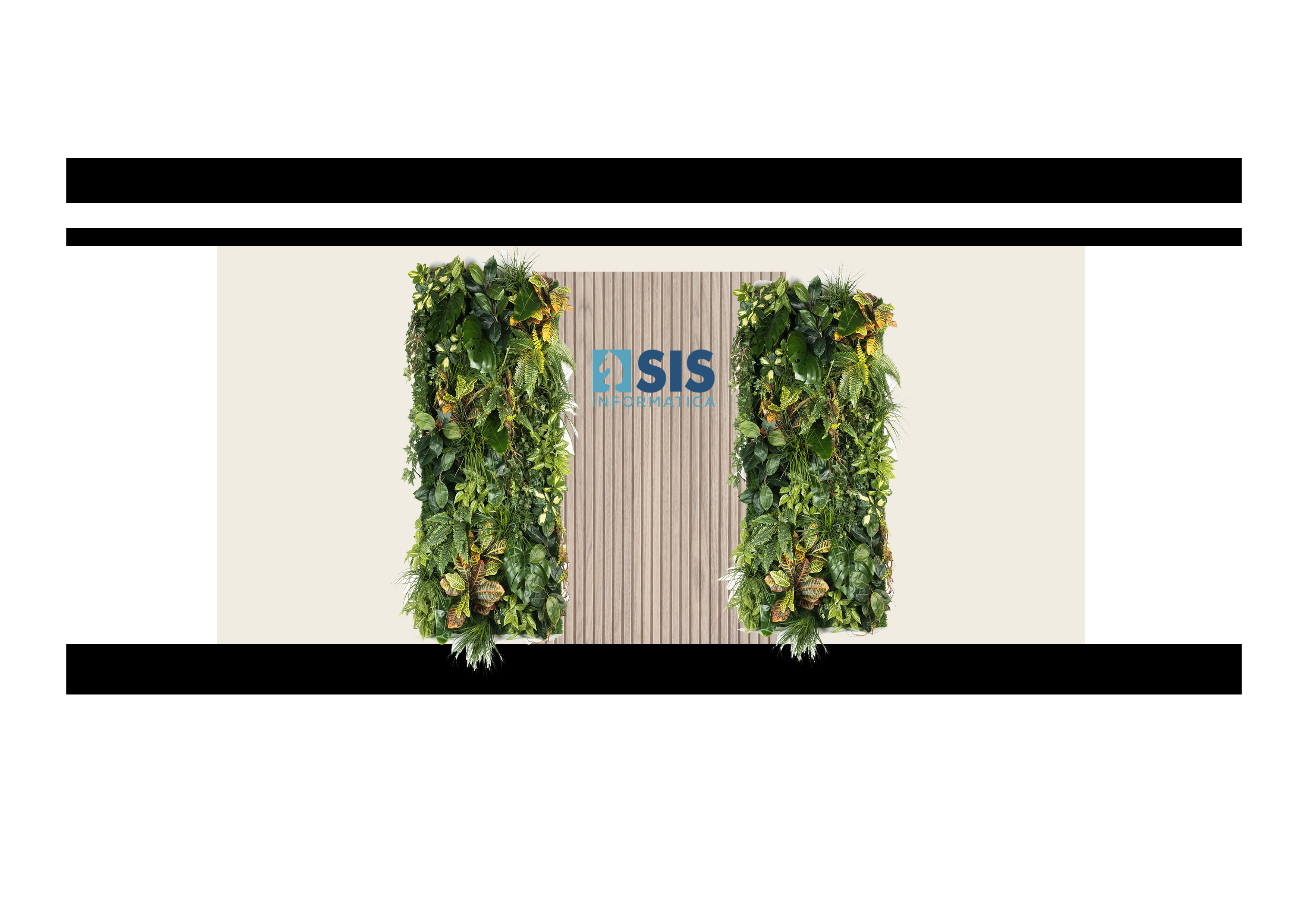 render a modern indoor garden wall display with lush greenery cascading over a textured vertical wooden panel in soft beige integrate vibrant shades of emerald olive and forest green foliage with subtle touches of golden yellow and deep brown the atmosphere should exude freshness and tranquility with natural daylighting enhancing the rich colors and textures frame the composition within sleek minimalist black borders adding a sophisticated contrast capture a serene and welcoming ambiance