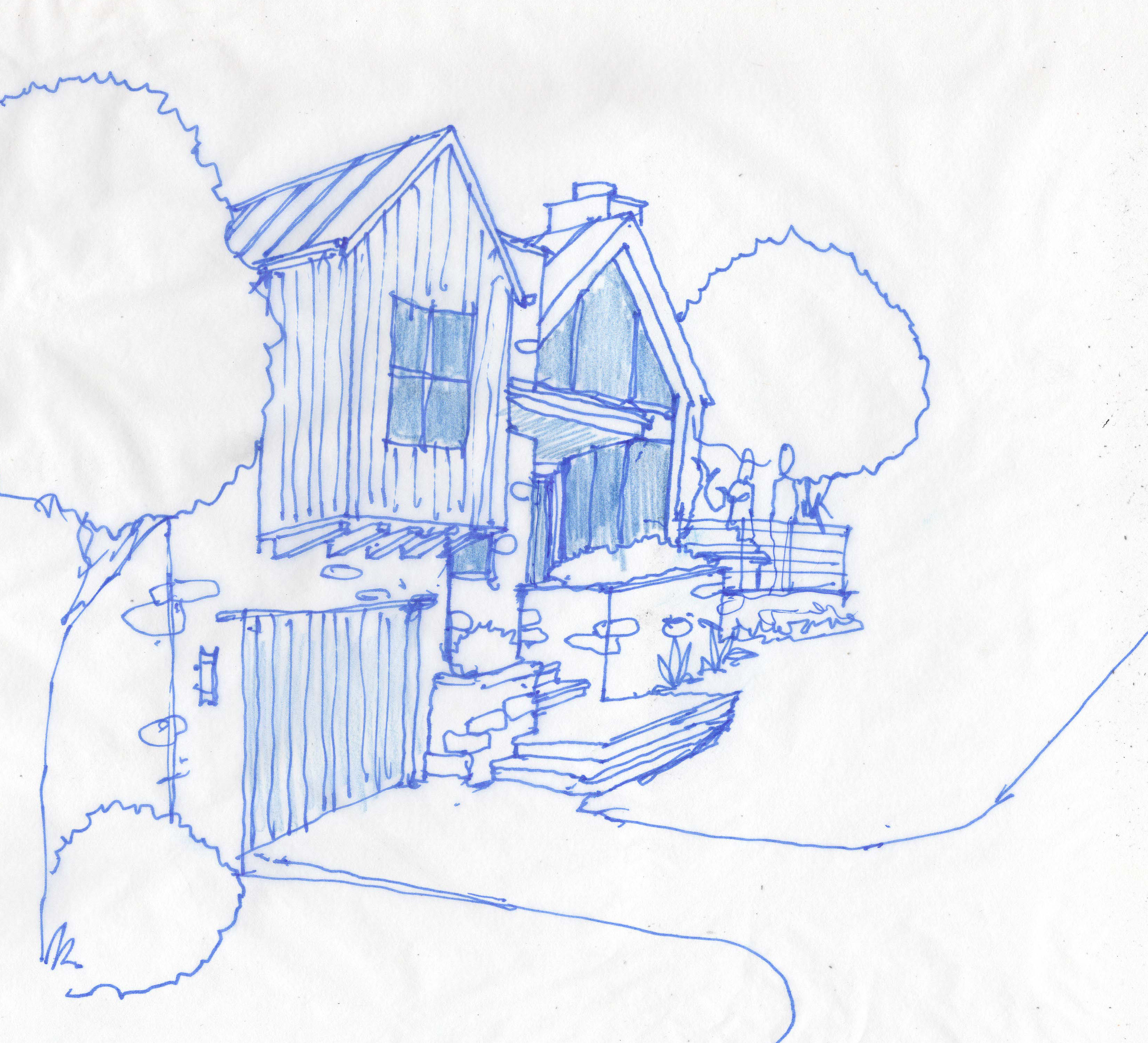 modern house on a hill standing seam roof stone and vertical siding fire pit on front terrace