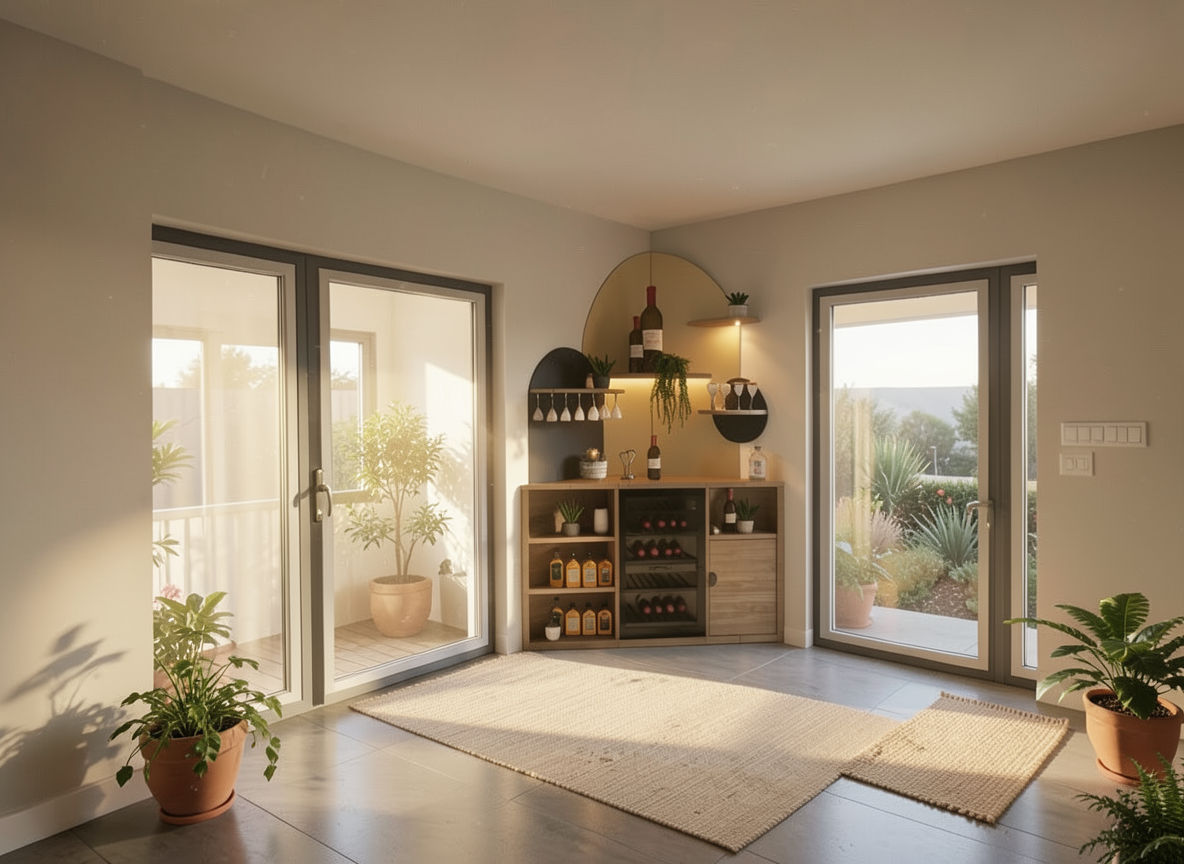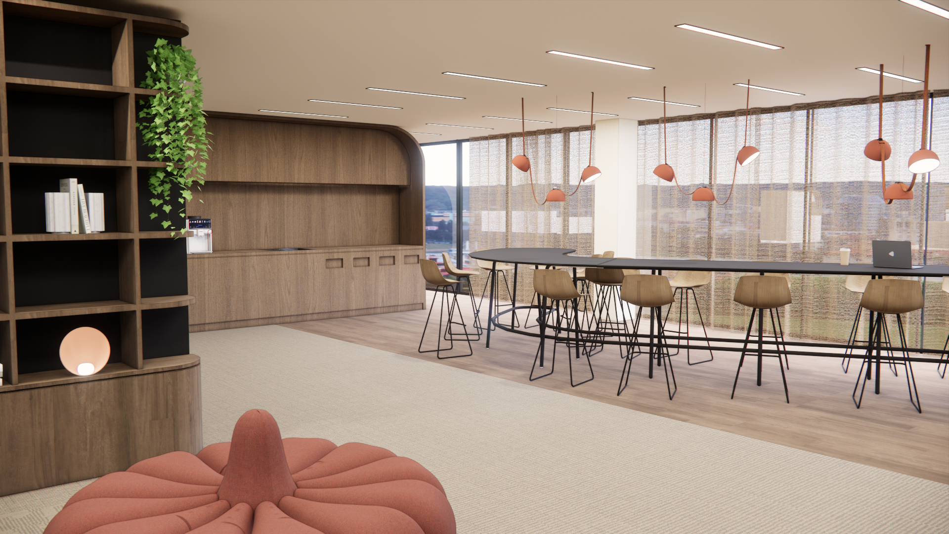 modern office interior with an open layout include a wooden shelving unit emphasizing dark brown and black tones emphasize a warm welcoming atmosphere with soft ambient lighting