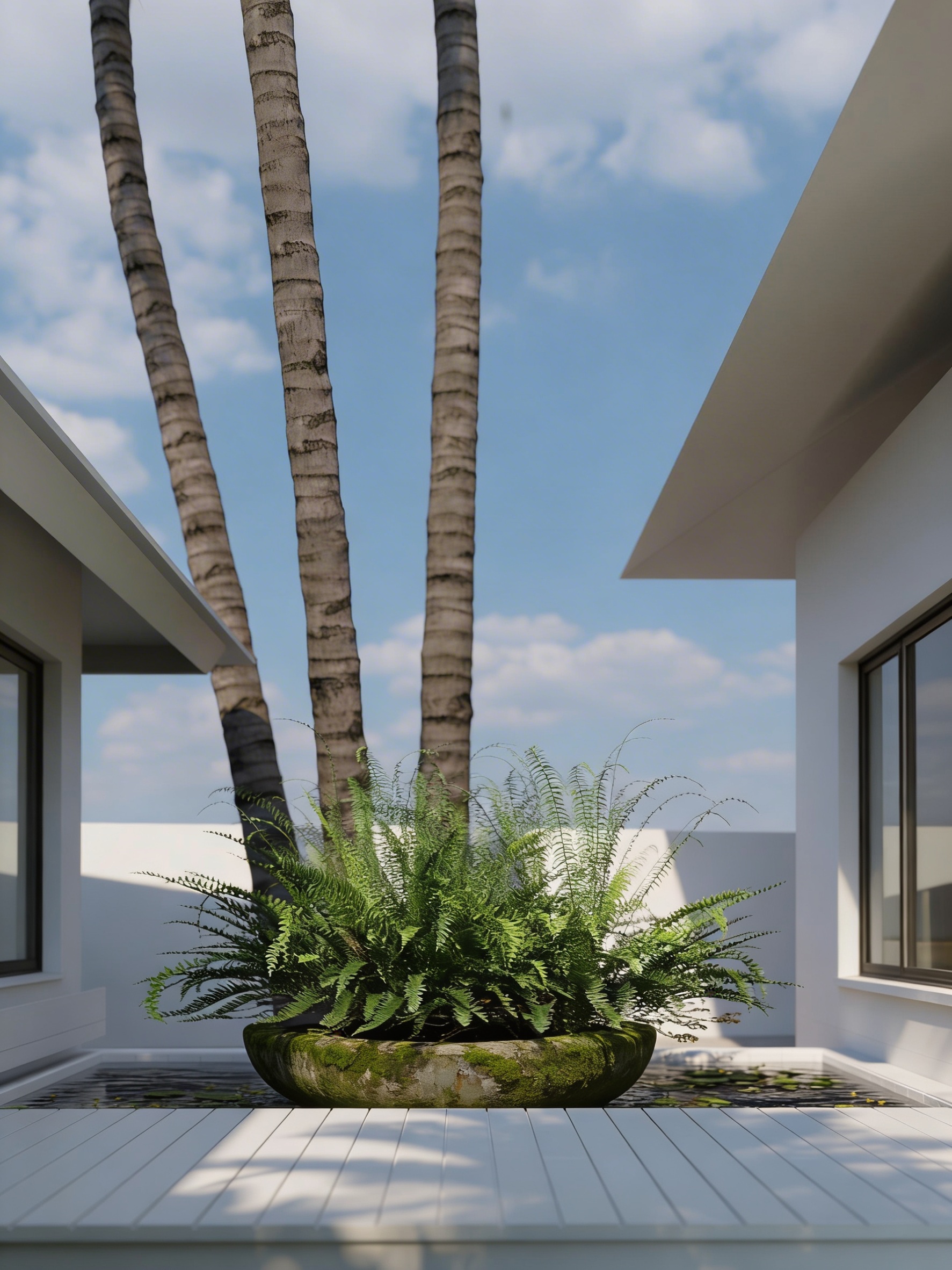make the fountain bowl more photo realistic and natural with moss and antique color arrange the place of the fountain bowl to be more aesthetic and minimalist remove the plantation on the top of the bowl water flows out from the bowl