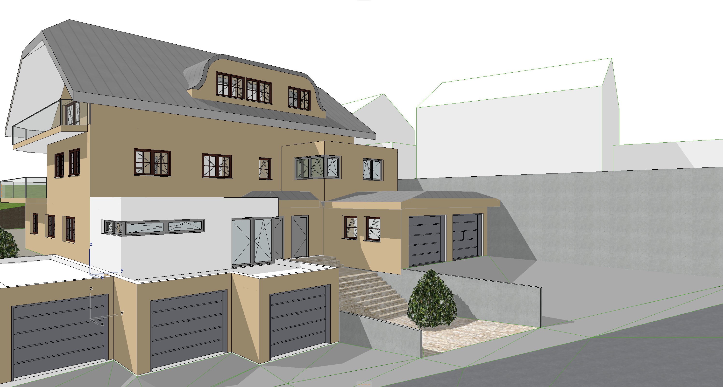 enhance the existing architectural rendering while strictly maintaining the original camera position perspective framing and composition do not change the geometry proportions or design of the building create a calm high quality and highly photorealistic visualization that gives the client a clear and believable impression of the building the atmosphere should feel professional balanced and natural similar to high end architectural photography avoid dramatic effects or overly stylized lighting use soft natural daylight with realistic global illumination subtle shadows and balanced exposure improve material quality with accurate physically realistic textures and reflections glass concrete metal wood etc surfaces should include slight natural imperfections to avoid a cgi appearance refine the environment so it looks complete and believable with natural ground textures and a subtle realistic background the overall image should feel calm clear and professional with the architecture remaining the main focus add 1 2 human figures to provide scale and a sense of life the people should appear subtle semi transparent and white almost like soft silhouette figures they should not attract too much attention or dominate the image but rather gently support the architectural presentation