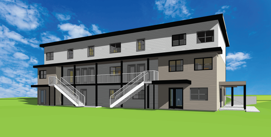 a modern three story building with a sleek design featuring a combination of light gray and beige ciment siding and bold black accents the structure includes two elegant white staircases leading to the second floor with large black framed windows providing a contemporary touch the surrounding landscape is a vibrant green lawn under a bright blue sky speckled with fluffy white clouds creating a serene and inviting atmosphere