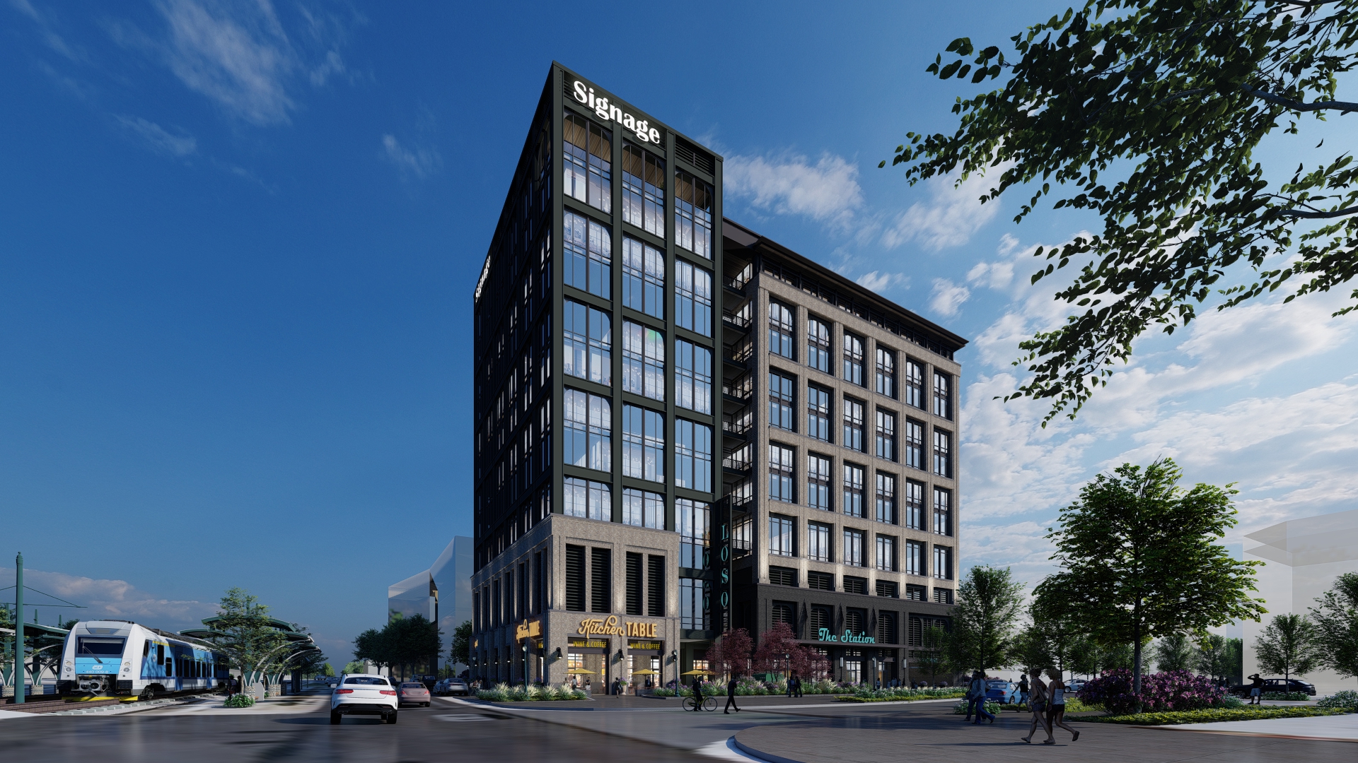 active office building rendering improve materials sunset gradient sky wet streets landscaping maintain colors