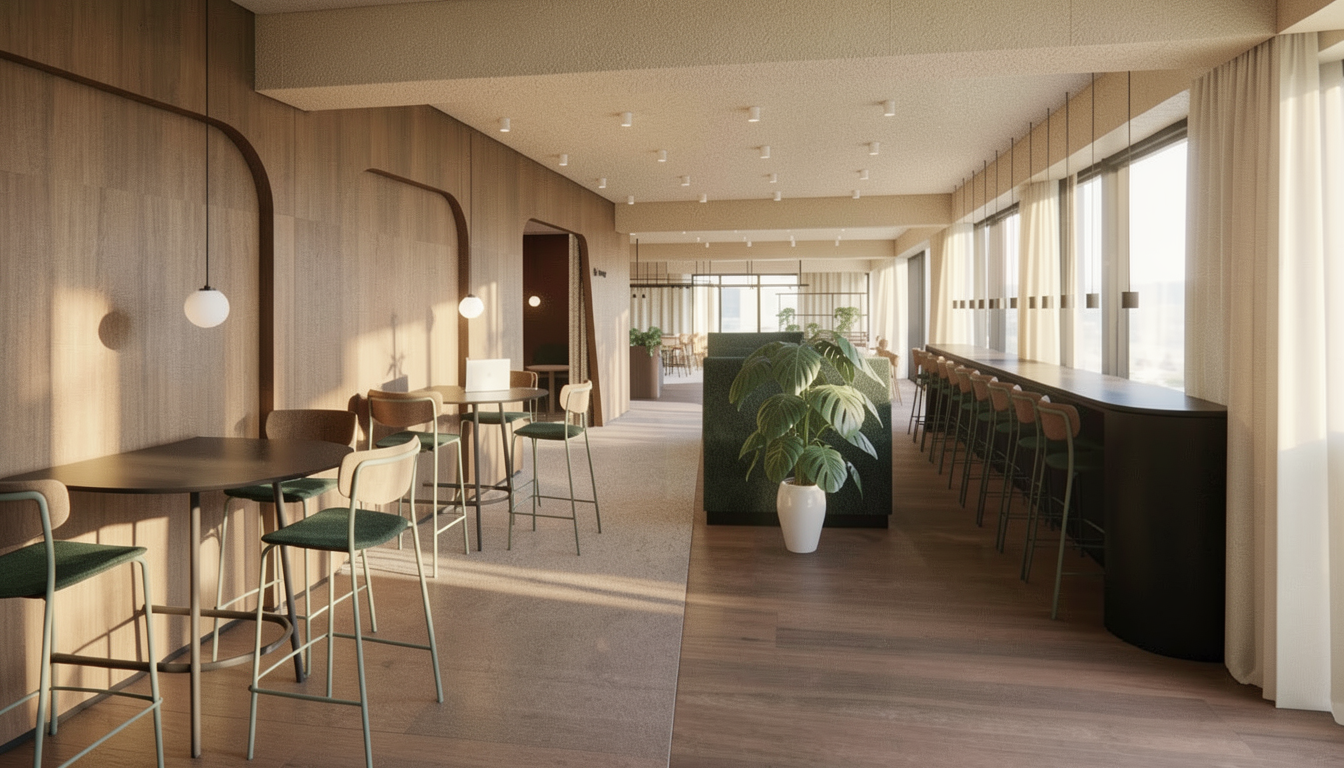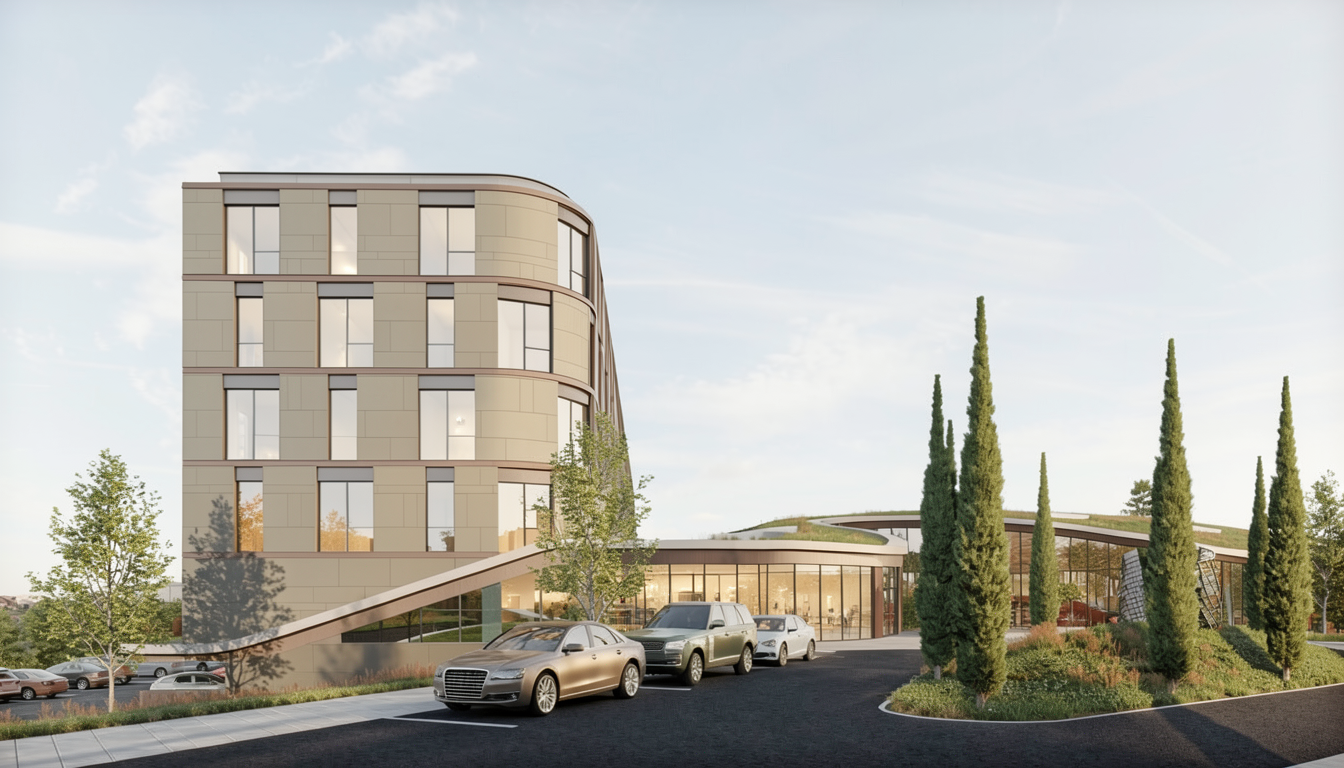 important preserve the existing geometry and the existing context exactly as provided preserve the existing windows do not add new windows do not modify alter reinterpret add remove scale or reshape any geometry do not change the site surroundings street layout neighboring buildings vegetation or context elements do not modify geometry scale proportions buildings road layout sidewalks or surrounding context in any way do not modify text soft sunny noon atmosphere diffused neutral natural daylight with subtle tones cinematic architectural mood weak interior lighting 4000k slight glowing from inside large glass surfaces with realistic reflections soft mirror effect environmental reflections of sky and surroundings important do not add new windows make the asphalt darker