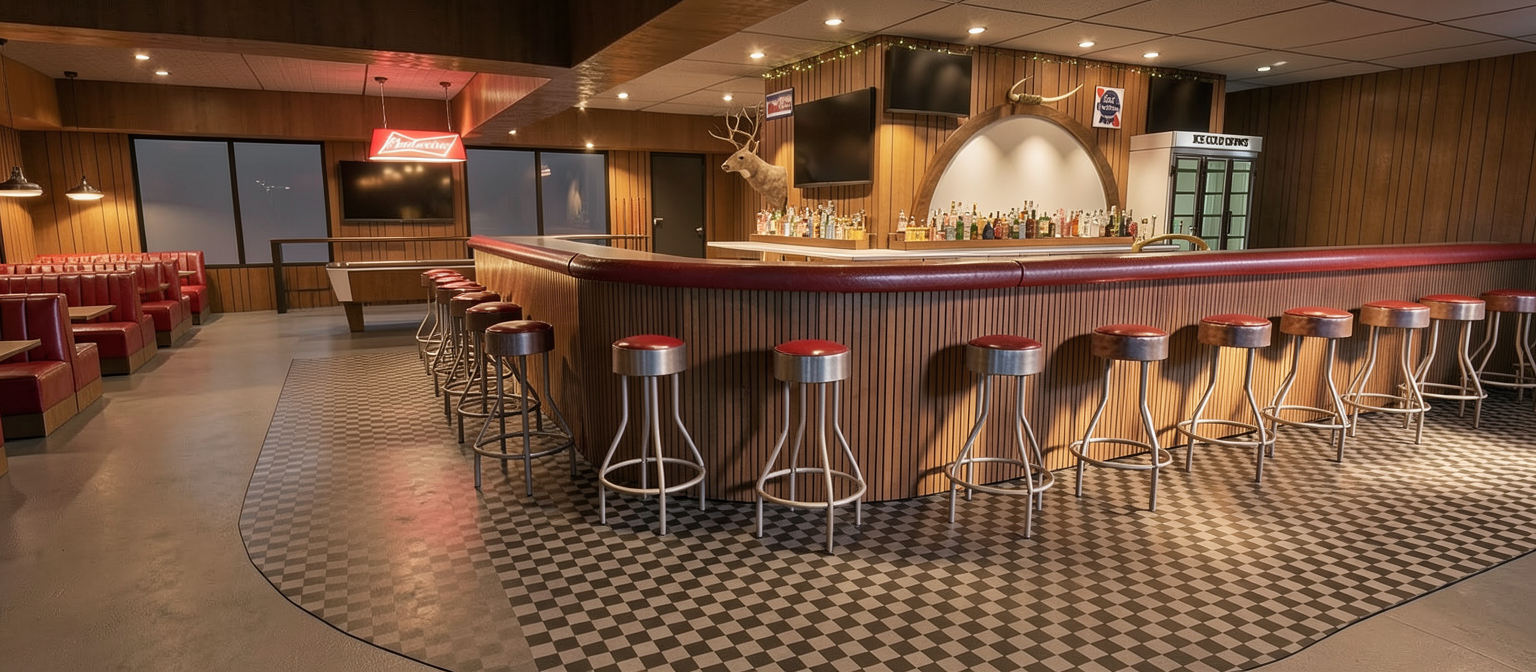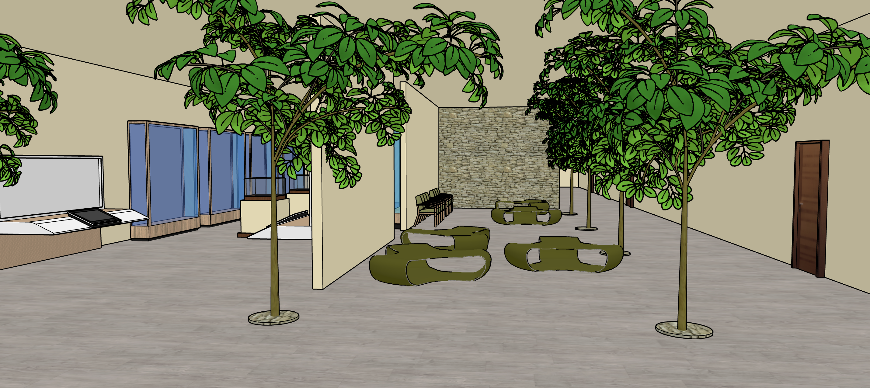 add one rectangular green acoustic ceiling baffles to both the nature museum exhibit side and the seating side add people and children looking at displays and sitting down add content in the displays recessed downlighting throughout and integrated in the baffles natural and artificial light