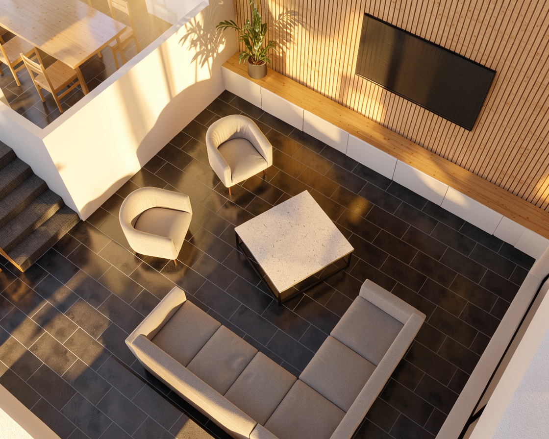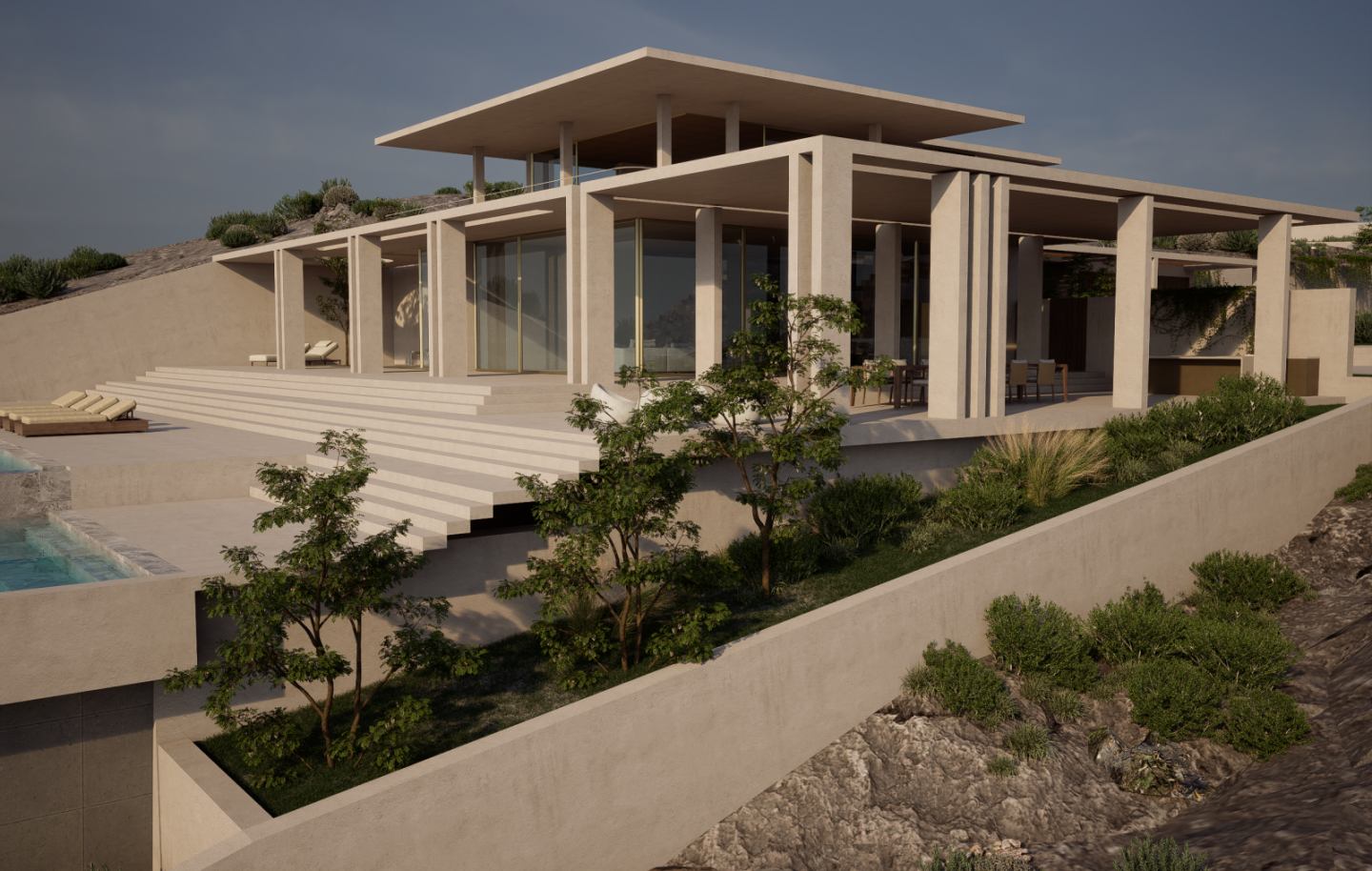 change the roof of the upper floor in the first building in front change it to something conceptual creative matching the landscape overlooking the cretan sea surrounding is cretanlandscape low plantation summer enhance it give it a golden hour feeling